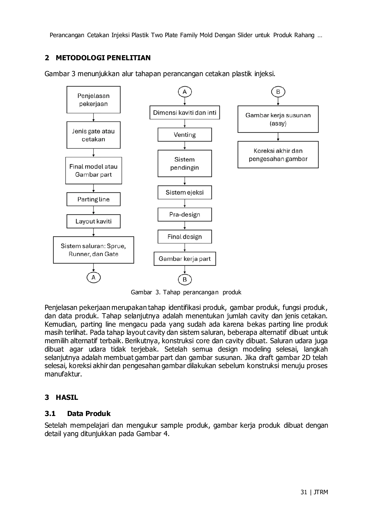 JTRM (Jurnal Teknologi dan Rekayasa Manufaktur)JTRM (Jurnal Teknologi dan Rekayasa Manufaktur)Tujuan penelitian ini adalah untuk menghasilkan rancangan peralatan pencetak plastik mesin injeksi berdasarkan produk rahang atas dan rahang bawah perangkap tikus mekanik. Kedua produk tersebut dicetak pada satu cetakan yang disebut dengan family mold sehingga memerlukan analisis aliran plastik untuk balancing aliran plastic. Produk rahang atas memiliki bentukan slider pada masing-masing bagian samping. Perhitungan untuk memastikan produk rahang atas ini dapat diejeksi tanpa mengalami kerusakan dilakukan. Software SolidWorks, TopSolid, dan Autocad digunakan untuk proses merancang family mold untuk produk rahang atas dan rahang bawah. Hasil rancangan didokumentasikan berupa gambar susunan dan gambar bagian. Dengan proses perancangan yang telah dilakukan, semua daftar tuntutan telah terpenuhi, rancangan dapat berfungsi dengan baik, dan dihasilkan dokumentasi teknik berupa gambar susunan dan gambar bagian.