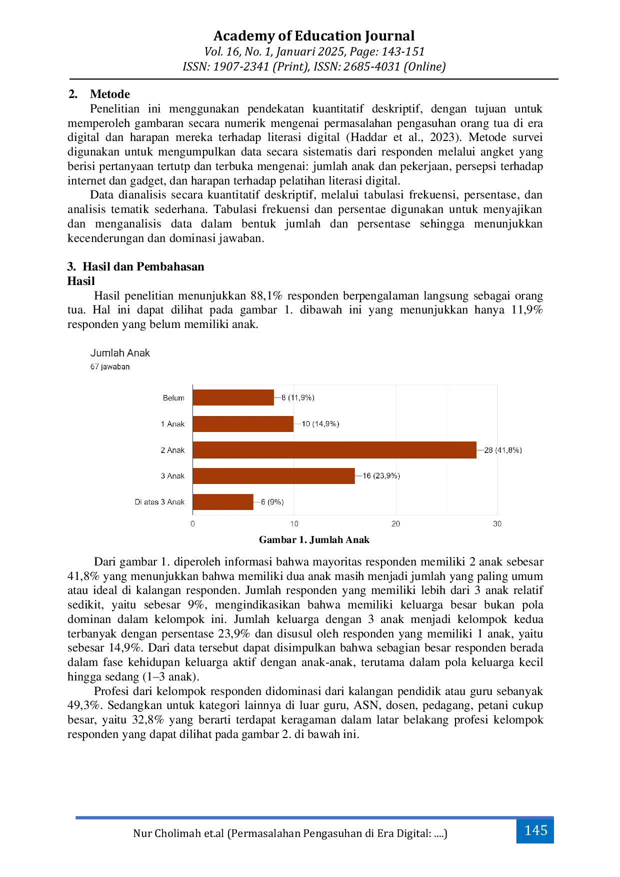 Academy of Education JournalAcademy of Education JournalPerkembangan teknologi digital yang pesat membawa dampak signifikan terhadap pola pengasuhan anak dalam keluarga. Penelitian ini bertujuan untuk mengidentifikasi permasalahan pengasuhan yang dihadapi orang tua di era digital serta menggali harapan mereka terhadap pelatihan literasi digital. Penelitian menggunakan pendekatan kuantitatif deskriptif dengan teknik survei terhadap 67 orang tua di salah satu lembaga PAUD yang mengikuti kegiatan literasi digital. Data dikumpulkan melalui angket yang memuat pertanyaan tertutup dan terbuka. Hasil penelitian menunjukkan bahwa sebagian besar orang tua menghadapi tantangan dalam mendampingi anak yang terlalu sering menggunakan gadget, serta mengalami kesulitan dalam menumbuhkan disiplin, tanggung jawab, dan pengelolaan emosi anak. Sebanyak 55,2% responden mengaku belum pernah menerima materi literasi digital secara jelas. Adapun harapan orang tua terhadap pelatihan literasi digital mencakup lima tema utama: menambah pengetahuan dan wawasan (40,7%), memperoleh solusi dan strategi konkret (20,3%), perubahan positif pada anak (13,6%), penguatan peran orang tua (10,2%), serta transformasi diri (15,3%). Temuan ini menunjukkan urgensi penguatan literasi digital berbasis keluarga, agar orang tua mampu mendampingi anak secara bijak dan efektif dalam menghadapi tantangan dunia digital.
