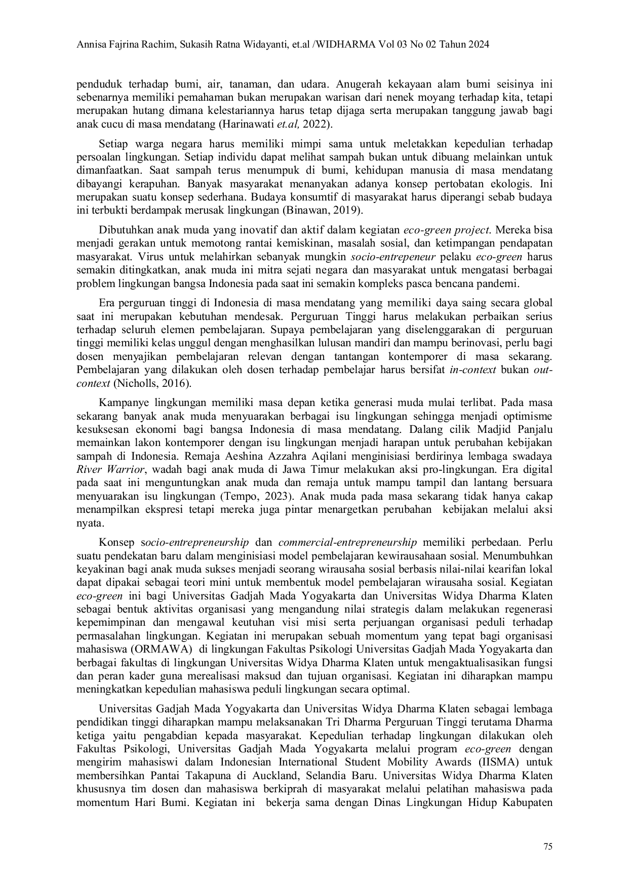 WIDHARMA - Jurnal Pengabdian Widya DharmaWIDHARMA - Jurnal Pengabdian Widya DharmaProgram pengabdian kepada masyarakat ini merupakan serangkaian kegiatan yang melibatkan mahasiswa dan sivitas akademika di lingkungan Fakultas Psikologi Universitas Gadjah Mada serta beberapa fakultas di Universitas Widya Dharma Klaten melalui program eco-green untuk kepedulian lingkungan. Metode pelaksanaan kegiatan meliputi: 1) pengumpulan data profil mahasiswa dan sivitas akademika di lingkungan Universitas Gadjah Mada dan Universitas Widya Dharma Klaten, serta 2) pemberdayaan mahasiswa melalui pelatihan eco-green mengenai empati mahasiswa terhadap lingkungan. Hasil kegiatan menunjukkan hasil positif di mana terjadi perubahan perilaku mahasiswa sebelum dan sesudah kegiatan. Mengembangkan jiwa kepemimpinan dan menumbuhkan rasa empati mahasiswa terhadap lingkungan melalui program eco-green tidak cukup dilakukan dalam waktu singkat, melainkan membutuhkan periode yang panjang dan berkelanjutan. Kegiatan di masa depan perlu terus dilaksanakan melalui beberapa perbaikan dalam metode implementasi.