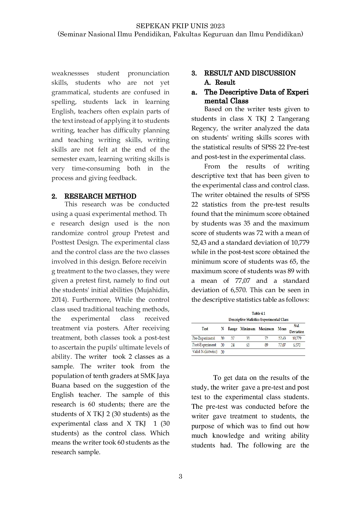 Proceeding Seminar Nasional Ilmu Pendidikan (SEPEKAN) FKIP Universitas Islam Syekh-YusufProceeding Seminar Nasional Ilmu Pendidikan (SEPEKAN) FKIP Universitas Islam Syekh-YusufTujuan dari penelitian ini adalah untuk mengetahui apakah poster dapat meningkatkan keterampilan menulis teks deskriptif pada siswa kelas sepuluh SMK Jaya Buana Kabupaten Tangerang pada tahun ajaran 2022-2023. Penelitian ini merupakan studi kuantitatif yang menggunakan 60 siswa sebagai sampel dengan sampel siswa X TKJ 1 dan X TKJ 2 yang diambil secara nonrandom menggunakan rancangan pseudo-eksperimen non-ekuivalen kontrol. Peneliti menggunakan tes siswa untuk mengumpulkan data melalui pre-test dan post-test. Hasil penelitian ini berupa perhitungan statistik dengan One-Sample Kolmogorov-Smirnov, diketahui bahwa signifikansi asimtotik pre-test dan post-test pada data kelas eksperimen adalah 0,000 < 0,05. Dapat disimpulkan bahwa Ha diterima dan Ho ditolak. Artinya, terdapat perbedaan yang signifikan dalam penggunaan media poster untuk meningkatkan keterampilan menulis siswa dalam teks deskriptif. Oleh karena itu, dapat disimpulkan bahwa terdapat pengaruh positif penggunaan poster terhadap peningkatan keterampilan menulis siswa kelas X SMK Jaya Buana Kabupaten Tangerang.