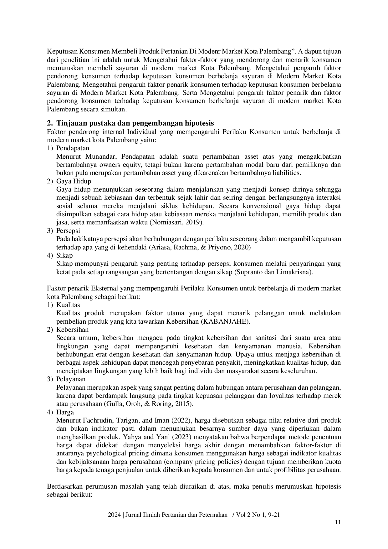Jurnal Ilmiah Pertanian dan PeternakanJurnal Ilmiah Pertanian dan PeternakanTujuan: Penelitian ini bertujuan untuk menentukan faktor-faktor yang memengaruhi keputusan konsumen dalam membeli sayuran di pasar modern Kota Palembang. Selain itu, penelitian ini juga mengkaji faktor pendorong dan penarik yang mendorong keputusan pembelian konsumen di pasar-pasar tersebut. Metode: Penelitian ini menggunakan metode analisis kuantitatif dan kualitatif. Data diuji menggunakan uji validitas dan reliabilitas, serta uji F (signifikansi simultan) dan uji t (signifikansi parsial) dalam analisis regresi linear berganda. Hasil: Analisis regresi menghasilkan nilai konstanta sebesar 0,343, menunjukkan bahwa ketika skor harga, pendapatan, dan gaya hidup adalah nol, skor keputusan pembelian tetap sebesar 0,343. Koefisien regresi untuk variabel harga (X1) adalah 0,375, menyiratkan hubungan positif antara harga dan keputusan pembelian. Ini berarti bahwa untuk setiap peningkatan satu unit pada harga (dengan variabel lain konstan), kemungkinan keputusan pembelian meningkat sebesar 0,375 unit. Kesimpulan: Harga, pendapatan, dan gaya hidup secara signifikan memengaruhi keputusan konsumen untuk membeli sayuran di pasar modern Palembang. Di antara faktor-faktor ini, harga memiliki pengaruh terkuat, menunjukkan bahwa keterjangkauan tetap menjadi faktor penting dalam pilihan konsumen.