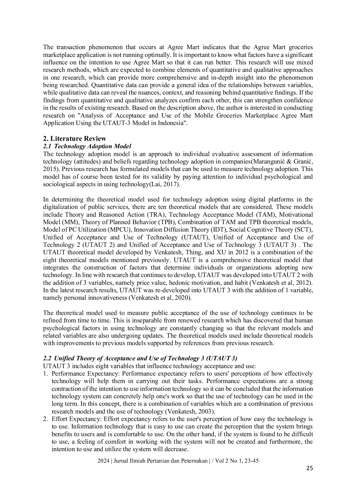 Jurnal Ilmiah Pertanian dan PeternakanJurnal Ilmiah Pertanian dan PeternakanTujuan penelitian ini adalah untuk menganalisis faktor-faktor yang mempengaruhi penerimaan dan penggunaan aplikasi Agree Mart mobile groceries marketplace dengan menerapkan model Unified Theory of Acceptance and Use of Technology 3 (UTAUT-3) dalam konteks Indonesia.