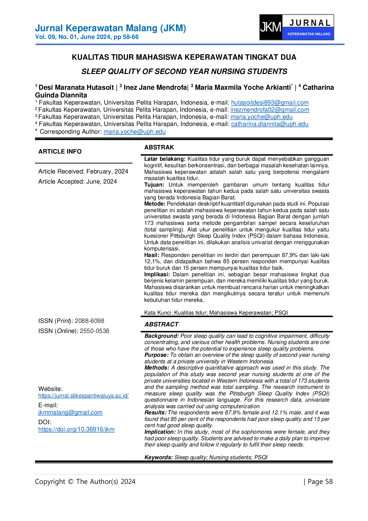 Dalam penelitian ini, sebagian besar mahasiswa keperawatan tingkat dua berjenis kelamin perempuan.Hasil penelitian menunjukkan bahwa mahasiswa jurusan keperawatan tingkat dua memiliki kualitas tidur buruk.Peneliti menyarankan agar mereka untuk membuat jadwal kegiatan harian sehingga kualitas tidur mahasiswa dapat ditingkatkan.Mahasiswa menjalankan jadwal tersebut secara teratur sehingga kebutuhan tidur dapat terpenuhi.