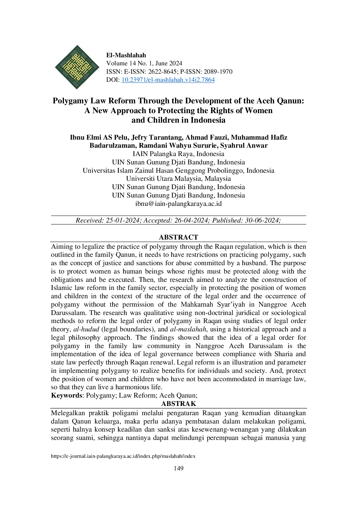 El-MashlahahEl-MashlahahMelegalkan praktik poligami melalui pengaturan Raqan yang kemudian dituangkan dalam Qanun keluarga, maka perlu adanya pembatasan dalam melakukan poligami, seperti halnya konsep keadilan dan sanksi atas kesewenang-wenangan yang dilakukan seorang suami, sehingga nantinya dapat melindungi perempuan sebagai manusia yang haknya harus dilindungi beserta kewajiban yang harus dijalankan. Penelitian ini bertujuan untuk menganalisis konstruksi reformasi hukum Islam di sektor keluarga, khususnya dalam melindungi posisi perempuan dan anak-anak dalam konteks struktur tatanan hukum dan terjadinya poligami tanpa izin Mahkamah Syariyah di Nanggroe Aceh Darussalam. Penelitian ini bersifat kualitatif melalui metode yuridis non-doktrinal atau sosiologis untuk mereformasi tatanan hukum poligami di raqan dengan menggunakan studi teori tatanan hukum, al-hudud (batas-batas hukum), dan al-maslahah, dengan menggunakan pendekatan sejarah dan pendekatan filsafat hukum. Temuan penelitian ini menunjukan bahwa gagasan tatanan hukum poligami dalam komunitas hukum keluarga di Nanggroe Aceh Darussalam adalah implementasi pemikiran pemerintahan hukum antara kepatuhan terhadap Syariah dan hukum negara dengan sempurna melalui pembaharuan Raqan. Reformasi hukum menjadi gambaran dan parameter dalam pelaksanaan poligami untuk mewujudkan manfaat bagi individu dan masyarakat. Melindungi posisi perempuan dan anak-anak yang belum terakomodasi dalam hukum perkawinan, sehingga mereka dapat menjalani kehidupan yang harmonis.