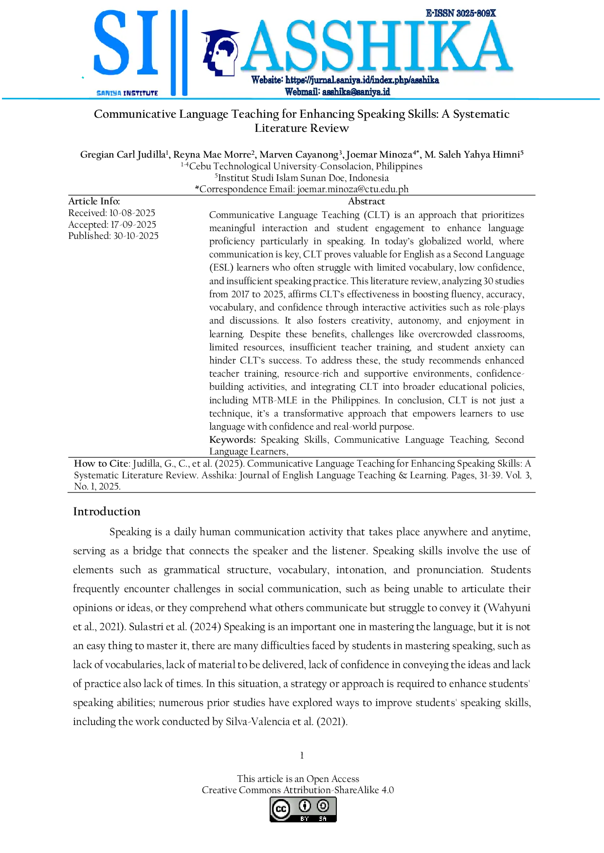 Asshika: Journal of English Language Teaching & LearningAsshika: Journal of English Language Teaching & LearningCommunicative Language Teaching (CLT) is an approach that prioritizes meaningful interaction and student engagement to enhance language proficiency particularly in speaking. In todays globalized world, where communication is key, CLT proves valuable for English as a Second Language (ESL) learners who often struggle with limited vocabulary, low confidence, and insufficient speaking practice. This literature review, analyzing 30 studies from 2017 to 2025, affirms CLTs effectiveness in boosting fluency, accuracy, vocabulary, and confidence through interactive activities such as role-plays and discussions. It also fosters creativity, autonomy, and enjoyment in learning. Despite these benefits, challenges like overcrowded classrooms, limited resources, insufficient teacher training, and student anxiety can hinder CLTs success. To address these, the study recommends enhanced teacher training, resource-rich and supportive environments, confidence-building activities, and integrating CLT into broader educational policies, including MTB-MLE in the Philippines. In conclusion, CLT is not just a technique, its a transformative approach that empowers learners to use language with confidence and real-world purpose.