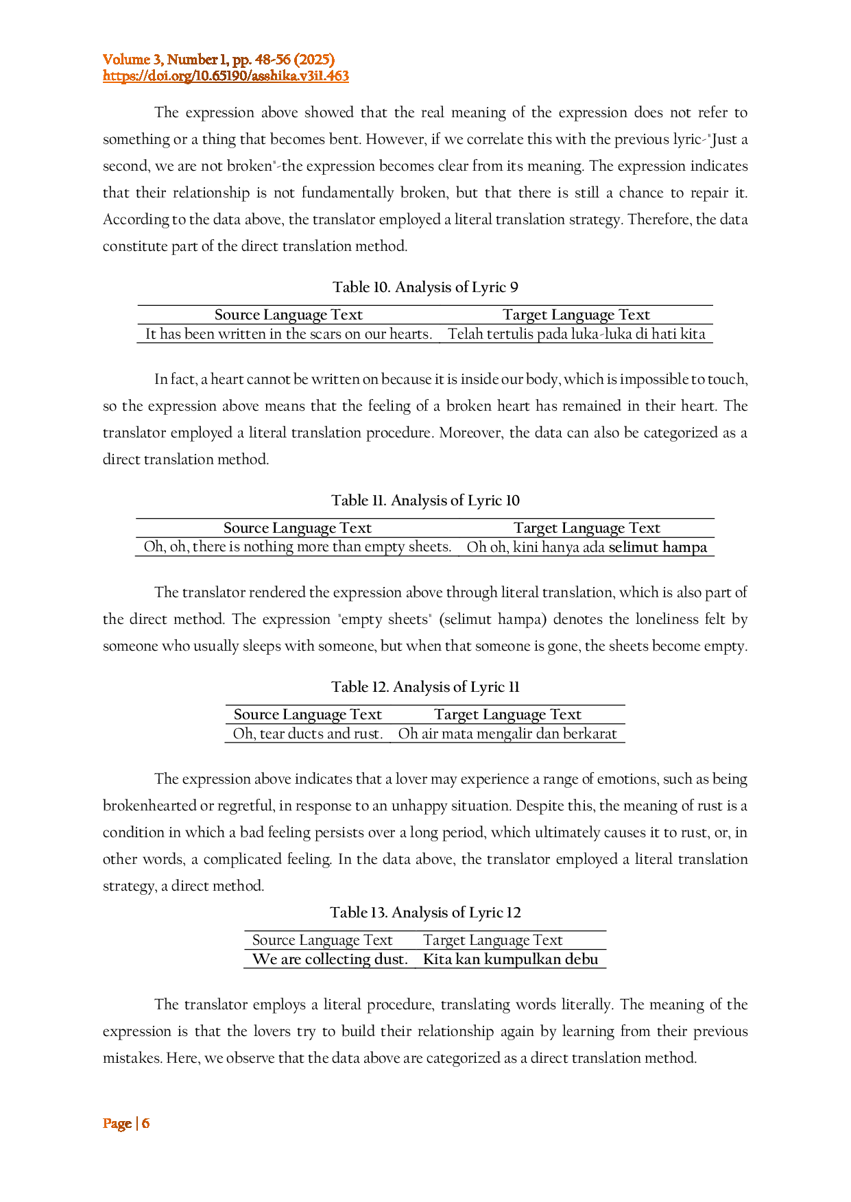 Penelitian ini menunjukkan bahwa berbagai jenis ekspresi kiasan seperti metonimia, sinkdokhe, idiom, dan hiperbola dalam lirik asli diterjemahkan ke dalam bahasa Indonesia menggunakan metode langsung maupun tidak langsung.Terjemahan harfiah sering digunakan, namun modulasi, transposisi, dan adaptasi juga diterapkan untuk menjaga kealamian dan nuansa emosional.Hasil ini menegaskan bahwa terjemahan lirik lagu memerlukan fleksibilitas dalam menyeimbangkan ketepatan semantik dan keterterimaan lirik, serta menunjukkan pentingnya kompetensi kiasan dan interpretasi kontekstual dalam pendidikan terjemahan.