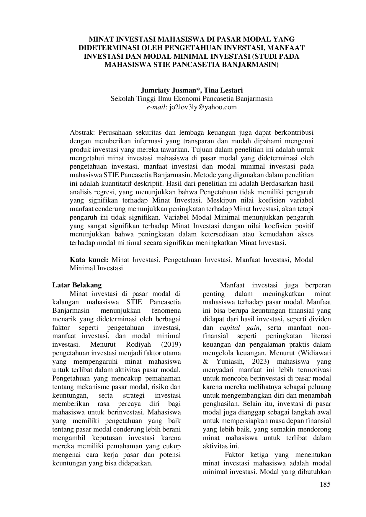 KINDAIKINDAIPerusahaan sekuritas dan lembaga keuangan dapat berkontribusi dengan memberikan informasi yang transparan dan mudah dipahami mengenai produk investasi yang mereka tawarkan. Tujuan dalam penelitian ini adalah untuk mengetahui minat investasi mahasiswa di pasar modal yang dideterminasi oleh pengetahuan investasi, manfaat investasi dan modal minimal investasi pada mahasiswa STIE Pancasetia Banjarmasin. Metode yang digunakan dalam penelitian ini adalah kuantitatif deskriptif. Hasil dari penelitian ini menunjukkan bahwa pengetahuan tidak memiliki pengaruh yang signifikan terhadap minat investasi. Meskipun nilai koefisien variabel manfaat cenderung menunjukkan peningkatan terhadap minat investasi, akan tetapi pengaruh ini tidak signifikan. Variabel modal minimal menunjukkan pengaruh yang sangat signifikan terhadap minat investasi dengan nilai koefisien positif menunjukkan bahwa peningkatan dalam ketersediaan atau kemudahan akses terhadap modal minimal secara signifikan meningkatkan minat investasi.