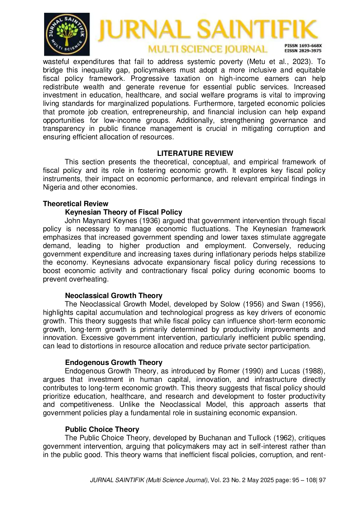 Jurnal Saintifik (Multi Science Journal)Jurnal Saintifik (Multi Science Journal)Nigerias economic paradox of sustained GDP growth alongside rising unemployment, poverty, and income inequality underscores the limitations of relying solely on headline economic indicators. While fiscal policy plays a crucial role in financial management, its effectiveness in fostering inclusive growth remains debatable. This study examines the impact of fiscal policy on economic growth and macroeconomic stability in Nigeria using time-series data from 2003 to 2023, employing econometric techniques such as regression analysis. The study evaluates the relationship between government expenditure, taxation, and income distribution, highlighting the structural inefficiencies that hinder fiscal effectiveness. Findings suggest that while fiscal policy has contributed to GDP growth, its impact is weakened by inefficient government spending, revenue dependency, particularly on oil, and institutional weaknesses. Moreover, fiscal interventions have failed to significantly reduce income inequality due to misallocation of resources and corruption. The study recommends targeted interventions to enhance fiscal policy effectiveness, including increased investment in human capital development, tax reforms, and improved governance. Strengthening fiscal discipline, diversifying revenue sources, and promoting transparency in public finance management are crucial for ensuring equitable and sustainable economic growth. These insights contribute to the broader discourse on the resource curse and the challenges of fiscal policy implementation in developing economies, offering valuable implications for policymakers in Nigeria and similar contexts.