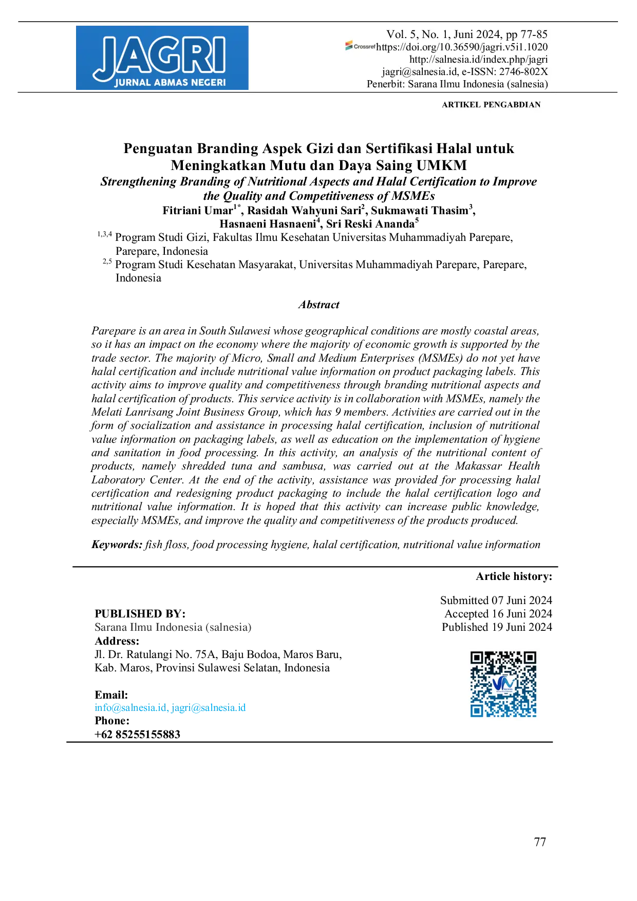 Jurnal Abmas Negeri (JAGRI)Jurnal Abmas Negeri (JAGRI)Parepare merupakan kawasan di Sulawesi Selatan yang keadaan geografisnya sebagian besar adalah wilayah pesisir pantai sehingga berdampak pada perekonomian dimana pertumbuhan ekonominya mayoritas didukung dari sektor perdagangan. Mayoritas Usaha Mikro Kecil Menengah (UMKM) belum memiliki serifikasi halal dan mencantumkan informasi nilai gizi pada label kemasan produk. Kegiatan ini bertujuan untuk meningkatkan mutu dan daya saing melalui branding aspek gizi dan sertifikasi halal produk. Kegiatan pengabdian ini bekerja sama dengan UMKM yakni Kelompok Usaha Bersama Melati Lanrisang yang beranggotakan 9 orang. Kegiatan dilaksanakan dalam bentuk sosialiasi dan pendampingan pengurusan sertifikasi halal, pencantuman informasi nilai gizi pada label kemasan, serta edukasi penerapan hygiene dan sanitasi pengolahan pangan. Pada kegiatan ini dilakukan analisis kandungan gizi produk yakni abon ikan tuna dan sambusa yang dilakukan di Balai Besar Laboratorium Kesehatan Makassar. Pendampingan dilakukan diakhir kegiatan untuk pengurusan sertifikasi halal dan desain kembali kemasan produk yang mencantumkan logo sertifikasi halal dan informasi nilai gizi. Kegiatan ini diharapkan dapat meningkatkan pengetahuan masyarakat khususnya UMKM dan meningkatkan mutu serta daya saing produk yang dihasilkan.