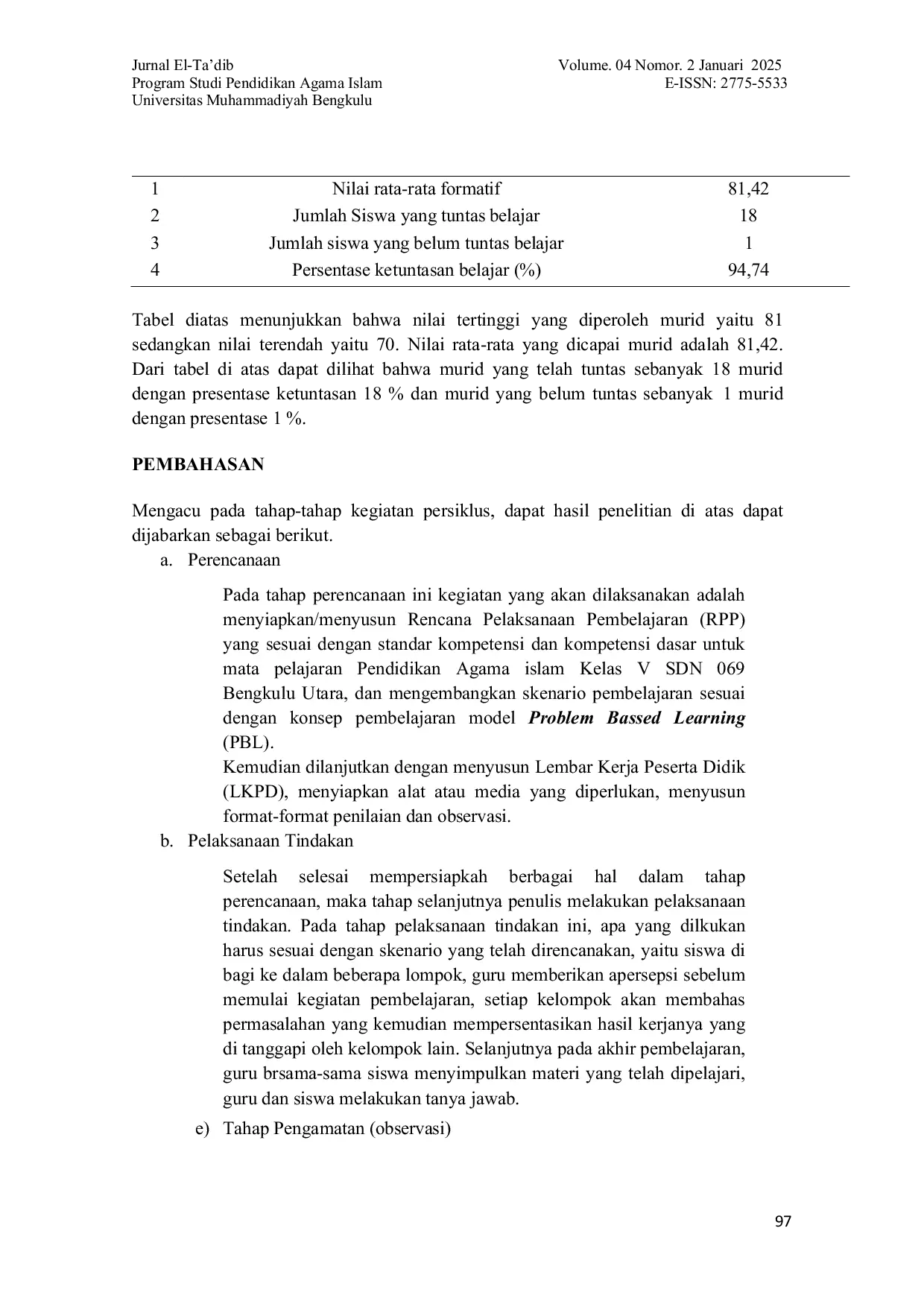 EL-TA’DIB: Journal of Islamic EducationEL-TA’DIB: Journal of Islamic EducationPenelitian ini bertujuan untuk meningkatkan hasil belajar murid pada mata pelajaran Pendidikan Agama Islam. Untuk mencapai tujuan ini, penelitian ini menggunakan strategi pembelajaran yang ideal. Salah satu cara yang dapat digunakan oleh guru adalah dengan menggunakan model pembelajaran berbasis masalah (PBL) untuk meningkatkan hasil belajar PAI siswa. Penelitian tindakan kelas ini dimulai dengan prasiklus dan dibagi menjadi dua siklus. Perencanaan, pelaksanaan tindakan, observasi, evaluasi, dan refleksi adalah bagian dari setiap siklus. Studi ini dilakukan pada siswa semester satu (ganjil) kelas V di SDN 069 Bengkulu Utara pada tahun akademik 2024/2025. Menurut hasil penelitian yang dilakukan pada 19 murid, pada kegiatan pra siklus, ada 10 murid yang tuntas (10 %), 9 murid yang belum tuntas (9 %), dengan nilai rata-rata 70,4%. Pada kegiatan siklus I, ada 17 murid yang tuntas (80 %), sedangkan 2 murid yang belum tuntas (2 %), dengan nilai rata-rata 74,4 %. Siklus II menunjukkan peningkatan yang signifikan dibandingkan dengan siklus sebelumnya. Murid yang sudah mencapai KKM berjumlah 18 (18 %) dan murid yang belum tuntas hanya 1 (1 %) dengan nilai rata-rata 81,42%. Studi ini menunjukkan bahwa penerapan metode pembelajaran PBL dapat meningkatkan hasil belajar Pendidikan Agama Islam pada murid kelas V SDN 069 Bengkulu Utara pada tahun pelajaran 2024/2025.