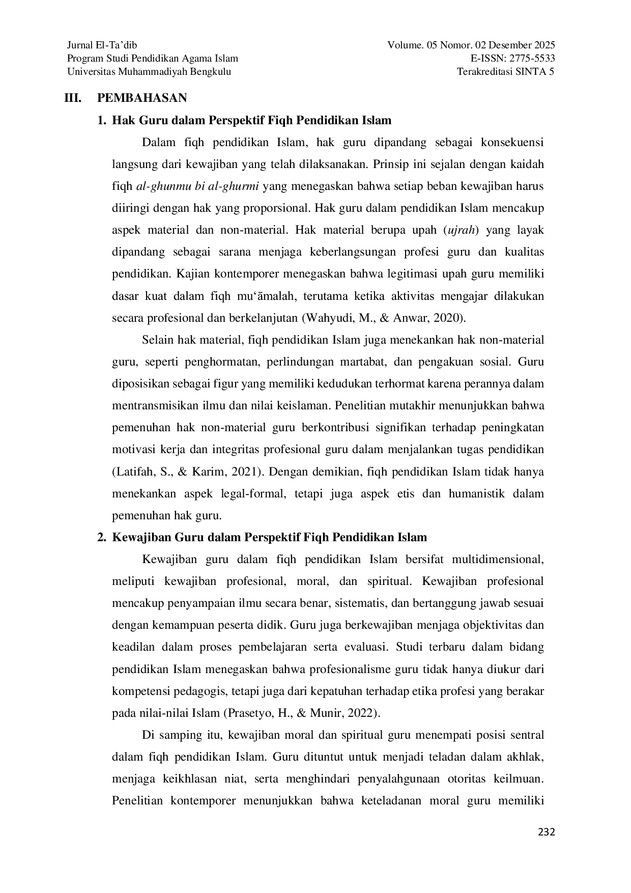 EL-TA’DIB: Journal of Islamic EducationEL-TA’DIB: Journal of Islamic EducationGuru memiliki kedudukan yang sangat strategis dalam pendidikan Islam, tidak hanya sebagai penyampai ilmu pengetahuan, tetapi juga sebagai pembentuk akhlak dan kepribadian peserta didik. Dalam perspektif fiqh pendidikan Islam, hubungan antara guru dan peserta didik tidak hanya bersifat pedagogis, tetapi juga mengandung dimensi hukum, moral, dan spiritual. Artikel ini bertujuan untuk mengkaji hak dan kewajiban guru berdasarkan perspektif fiqh pendidikan Islam serta relevansinya dengan praktik pendidikan kontemporer. Metode penelitian yang digunakan adalah studi kepustakaan (library research) dengan menganalisis sumber-sumber fiqh klasik, Al-Quran, hadis, serta literatur pendidikan Islam kontemporer. Hasil kajian menunjukkan bahwa fiqh pendidikan Islam memberikan perhatian yang seimbang antara pemenuhan hak guru, baik material maupun non-material, dan pelaksanaan kewajiban guru yang bersifat profesional, moral, dan spiritual. Keseimbangan antara hak dan kewajiban tersebut menjadi prinsip fundamental dalam menciptakan pendidikan yang adil, bermartabat, dan berorientasi pada pembentukan insan berakhlak mulia. Dengan demikian, pemahaman fiqh pendidikan Islam tentang hak dan kewajiban guru dapat menjadi landasan normatif dalam memperkuat perlindungan dan profesionalitas guru di era modern.