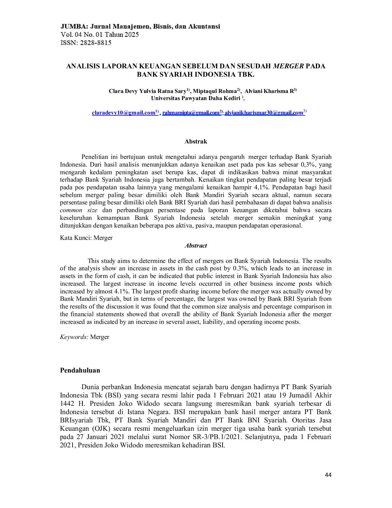 JUMBA (Jurnal Manajemen, Bisnis, dan Akuntansi)JUMBA (Jurnal Manajemen, Bisnis, dan Akuntansi)Penelitian ini bertujuan untuk mengetahui adanya pengaruh merger terhadap Bank Syariah Indonesia. Dari hasil analisis menunjukkan adanya kenaikan aset pada pos kas sebesar 0,3%, yang mengarah kedalam peningkatan aset berupa kas, dapat di indikasikan bahwa minat masyarakat terhadap Bank Syariah Indonesia juga bertambah. Kenaikan tingkat pendapatan paling besar terjadi pada pos pendapatan usaha lainnya yang mengalami kenaikan hampir 4,1%. Pendapatan bagi hasil sebelum merger paling besar dimiliki oleh Bank Mandiri Syariah secara aktual, namun secara persentase paling besar dimiliki oleh Bank BRI Syariah dari hasil pembahasan di dapat bahwa analisis common size dan perbandingan persentase pada laporan keuangan diketahui bahwa secara keseluruhan kemampuan Bank Syariah Indonesia setelah merger semakin meningkat yang ditunjukkan dengan kenaikan beberapa pos aktiva, pasiva, maupun pendapatan operasional.
