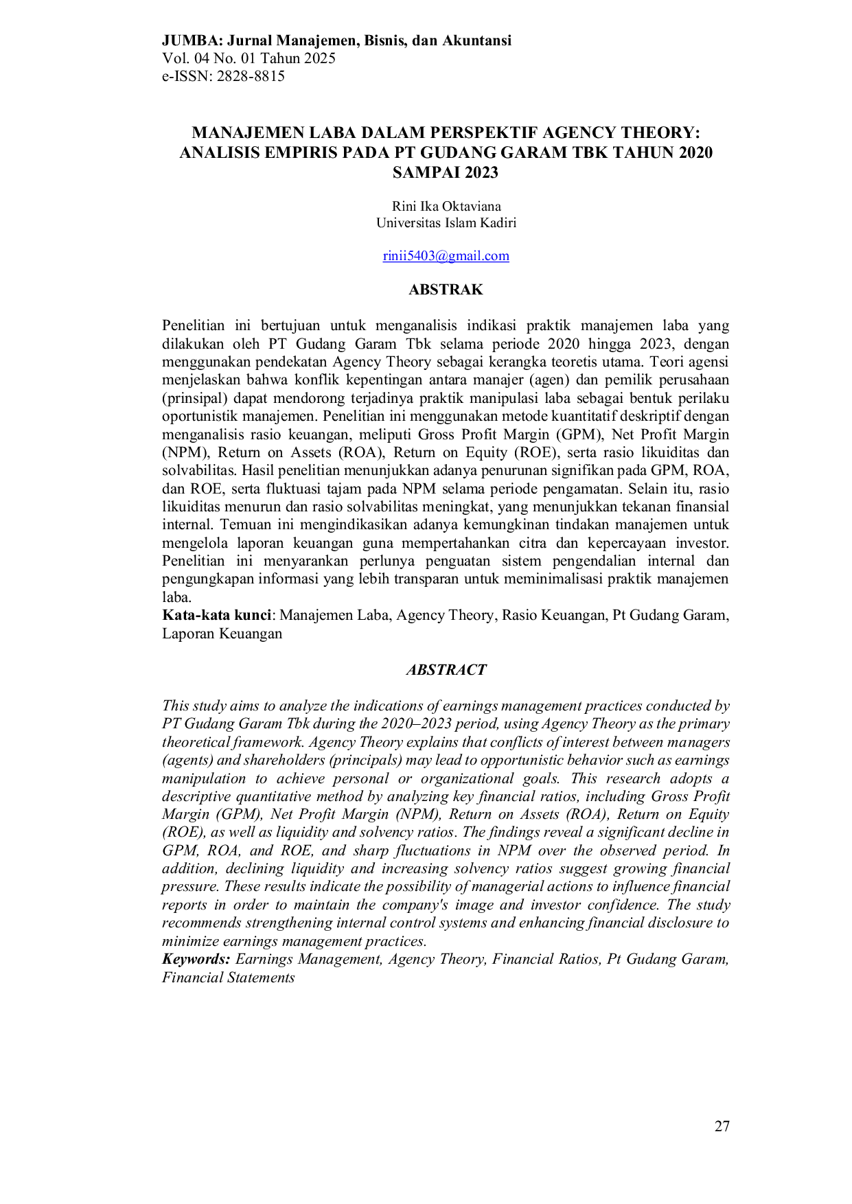 JUMBA (Jurnal Manajemen, Bisnis, dan Akuntansi)JUMBA (Jurnal Manajemen, Bisnis, dan Akuntansi)Penelitian ini bertujuan untuk menganalisis indikasi praktik manajemen laba yang dilakukan oleh PT Gudang Garam Tbk selama periode 2020 hingga 2023, dengan menggunakan pendekatan Agency Theory sebagai kerangka teoretis utama. Teori agensi menjelaskan bahwa konflik kepentingan antara manajer (agen) dan pemilik perusahaan (prinsipal) dapat mendorong terjadinya praktik manipulasi laba sebagai bentuk perilaku oportunistik manajemen. Penelitian ini menggunakan metode kuantitatif deskriptif dengan menganalisis rasio keuangan, meliputi Gross Profit Margin (GPM), Net Profit Margin (NPM), Return on Assets (ROA), Return on Equity (ROE), serta rasio likuiditas dan solvabilitas. Hasil penelitian menunjukkan adanya penurunan signifikan pada GPM, ROA, dan ROE, serta fluktuasi tajam pada NPM selama periode pengamatan. Selain itu, rasio likuiditas menurun dan rasio solvabilitas meningkat, yang menunjukkan tekanan finansial internal. Temuan ini mengindikasikan adanya kemungkinan tindakan manajemen untuk mengelola laporan keuangan guna mempertahankan citra dan kepercayaan investor. Penelitian ini menyarankan perlunya penguatan sistem pengendalian internal dan pengungkapan informasi yang lebih transparan untuk meminimalisasi praktik manajemen laba.