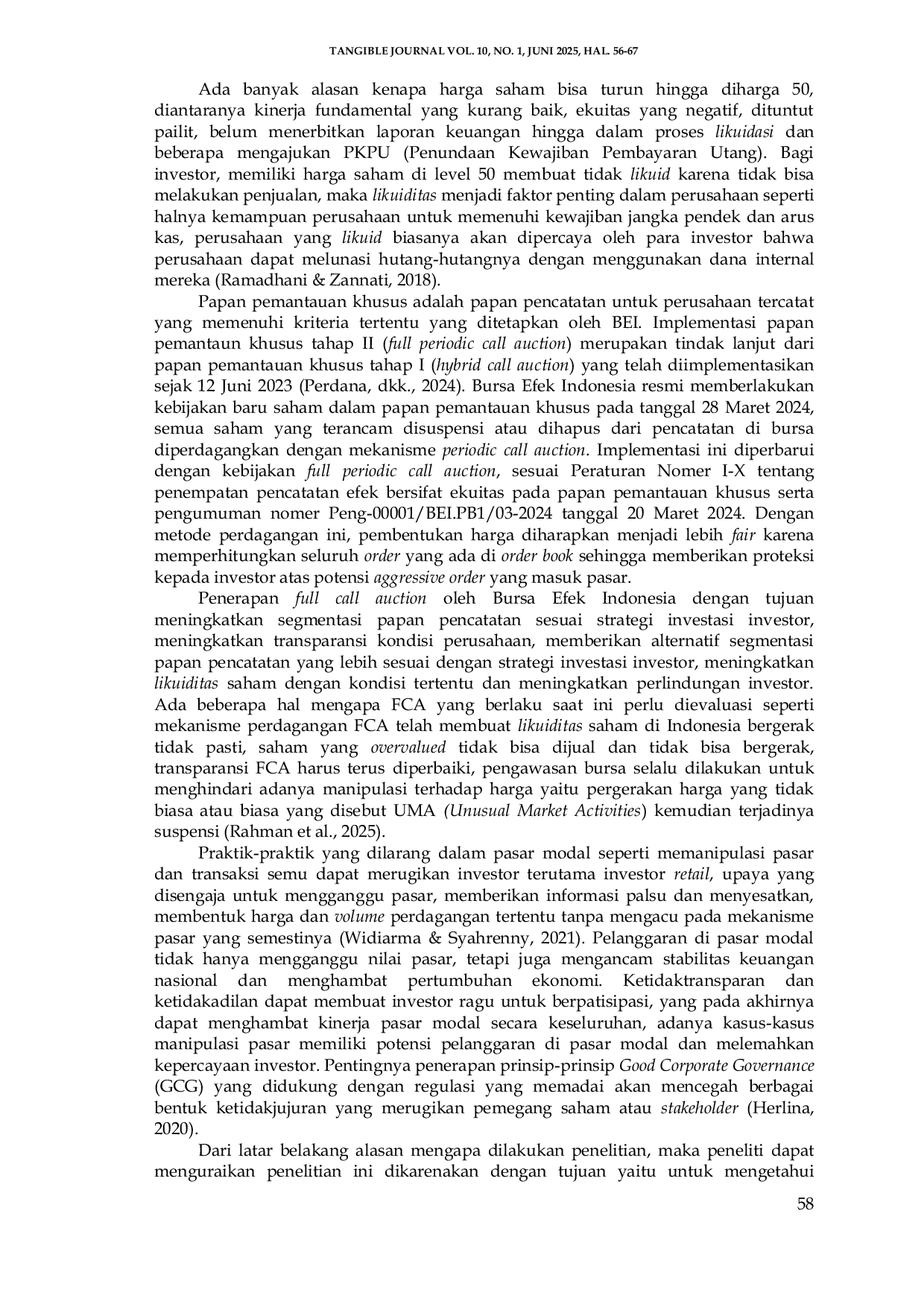 Tangible JournalTangible JournalPenelitian ini bertujuan untuk mengetahui seberapa efektif kebijakan Papan Pemantauan Khusus (Full Call Auction) yang telah dijalankan selama ini di Bursa Efek Indonesia (BEI). Full Call Auction (FCA) merupakan metode lelang berkala secara penuh, sistem lelang periodik yang digunakan untuk menentukan harga saham pada waktu-waktu tertentu di Bursa Efek. Penelitian ini menggunakan beberapa teknik analisis seperti independent t test, uji korelasi pearson, mann whitney, spearman dan kolmogorov-smirnov. Berdasarkan jumlah pengamatan data sampel sebelum full call auction sebanyak 239 data dan setelah full call auction sebanyak 235 data dengan kurun waktu setahun sebelum dan setahun sesudah full call auction. Hasil penelitian ini menunjukkan bahwa pengaruh kebijakan full call auction ini yang telah berjalan dapat meningkatkan jumlah volume, value dan pergerakan IHSG, walaupun secara frekuensi sedikit menurun tetapi tidak signifikan. Untuk uji korelasi bahwa volume, value dan frekuensi dengan pergerakan IHSG (close) saling berhubungan dan bergerak searah dan beriringan yang berarti menunjukkan kebijakan full call auction selama ini berjalan efektif dan menambah likuiditas. Rekomendasi untuk pemerintah melalui BEI dapat memberikan kebijakan-kebijakan yang mumpuni, pruden dan berkesinambungan untuk kemajuan Pasar Modal Indonesia.