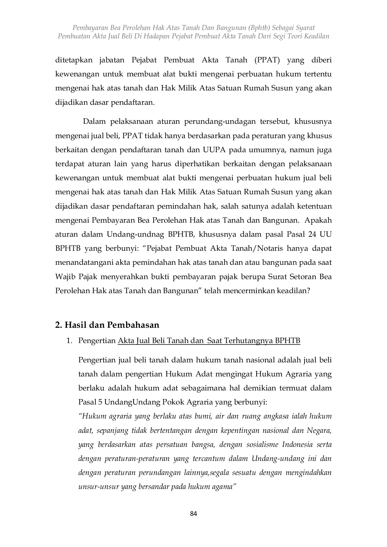 Fortiori Law JournalFortiori Law JournalDalam prinsip-prinsip pokok yang dijadikan dasar peletakan hukum, Undang-Undang Pokok Agraria (UUPA) mendasarkan konsep pemikiran pada hukum Adat yang berlaku di Indonesia. Peralihan hak atas tanah merupakan proses bergantinya pemegang hak tanah dari yang lama ke yang baru, yang terdiri dari dua ragam, yaitu beralih dan dialihkan. Beralih terjadi tanpa perbuatan hukum oleh pemiliknya, seperti warisan, sedangkan dialihkan terjadi melalui perbuatan hukum, salah satunya jual beli. Pengertian jual beli tanah dalam hukum nasional mengacu pada hukum adat, mengingat UUPA berlandaskan hukum adat. Dalam pelaksanaan pendaftaran tanah, Peraturan Pemerintah Nomor 24 Tahun 1997 menetapkan Pejabat Pembuat Akta Tanah (PPAT) berwenang membuat alat bukti perbuatan hukum terkait hak atas tanah yang menjadi dasar pendaftaran. Dalam pelaksanaan kewenangan PPAT terkait akta jual beli, terdapat ketentuan perpajakan yang menyebabkan ketidakpastian hukum, khususnya mengenai kewajiban pembayaran BPHTB sebagai syarat penandatanganan akta jual beli. Penelitian ini mengkaji apakah ketentuan dalam Undang-undang BPHTB, khususnya Pasal 24, telah mencerminkan keadilan menurut Teori Keadilan.