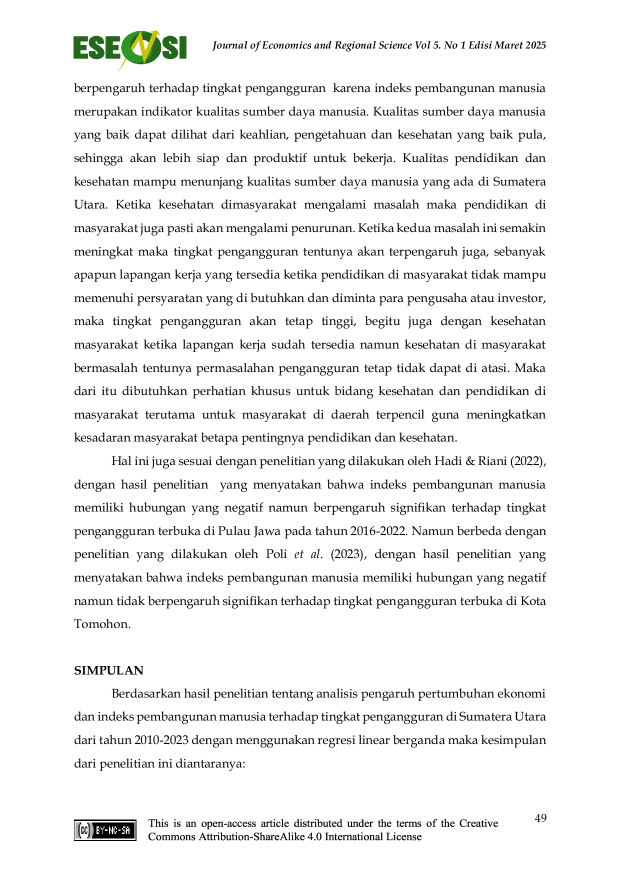Journal of Economics and Regional ScienceJournal of Economics and Regional SciencePenelitian ini bertujuan untuk mengetahui pengaruh pertumbuhan ekonomi dan indeks pembangunan manusia terhadap tingkat pengangguran di Sumatera Utara selama tahun 2010-2023. Data yang digunakan dalam penelitian ini adalah data sekunder yang diperoleh dari Badan Pusat Statistik Provinsi Sumatera Utara. Data yang diperoleh kemudian dianalisis menggunakan aplikasi Eviews 10. Metode yang digunakan dalam penelitian yaitu metode analisis regresi linear berganda. Variabel dalam penelitian ini meliputi tingkat pengangguran sebagai variabel terikat serta pertumbuhan ekonomi dan indeks pembangunan manusia sebagai variabel bebas. Hasil penelitian menunjukkan bahwa pertumbuhan ekonomi berpengaruh negatif dan signifikan terhadap tingkat pengangguran di Sumatera Utara serta Indeks pembangunan manusia juga memiliki pengaruh negatif dan signifikan terhadap tingkat pengangguran di Sumatera Utara. Pertumbuhan ekonomi dan indeks pembangunan manusia berpengaruh secara signifikan terhadap tingkat pengangguran di Sumatera Utara.
