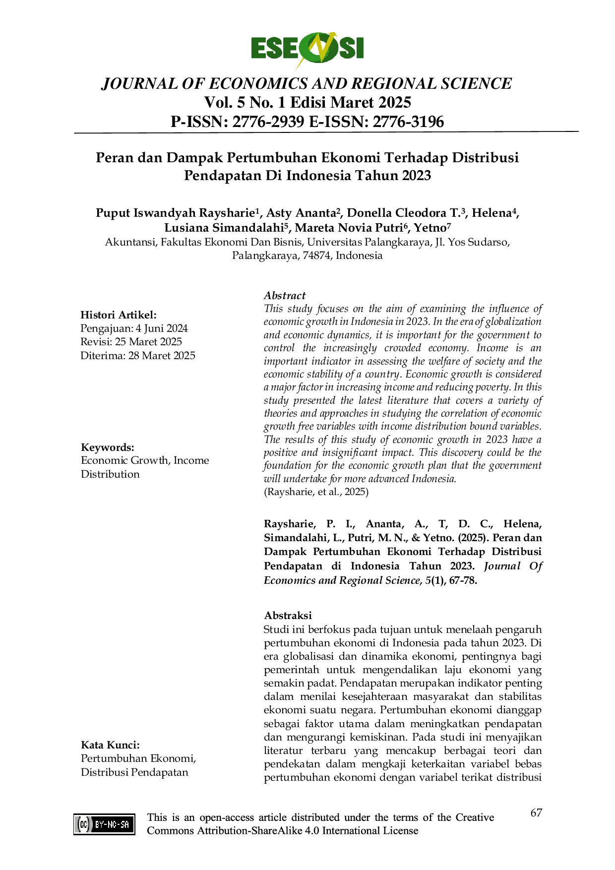 Journal of Economics and Regional ScienceJournal of Economics and Regional ScienceThis study focuses on the aim of examining the influence of economic growth in Indonesia in 2023. In the era of globalization and economic dynamics, it is important for the government to control the increasingly crowded economy. Income is an important indicator in assessing the welfare of society and the economic stability of a country. Economic growth is considered a major factor in increasing income and reducing poverty. In this study presented the latest literature that covers a variety of theories and approaches in studying the correlation of economic growth free variables with income distribution bound variables. The results of this study of economic growth in 2023 have a positive and insignificant impact. This discovery could be the foundation for the economic growth plan that the government will undertake for more advanced Indonesia.