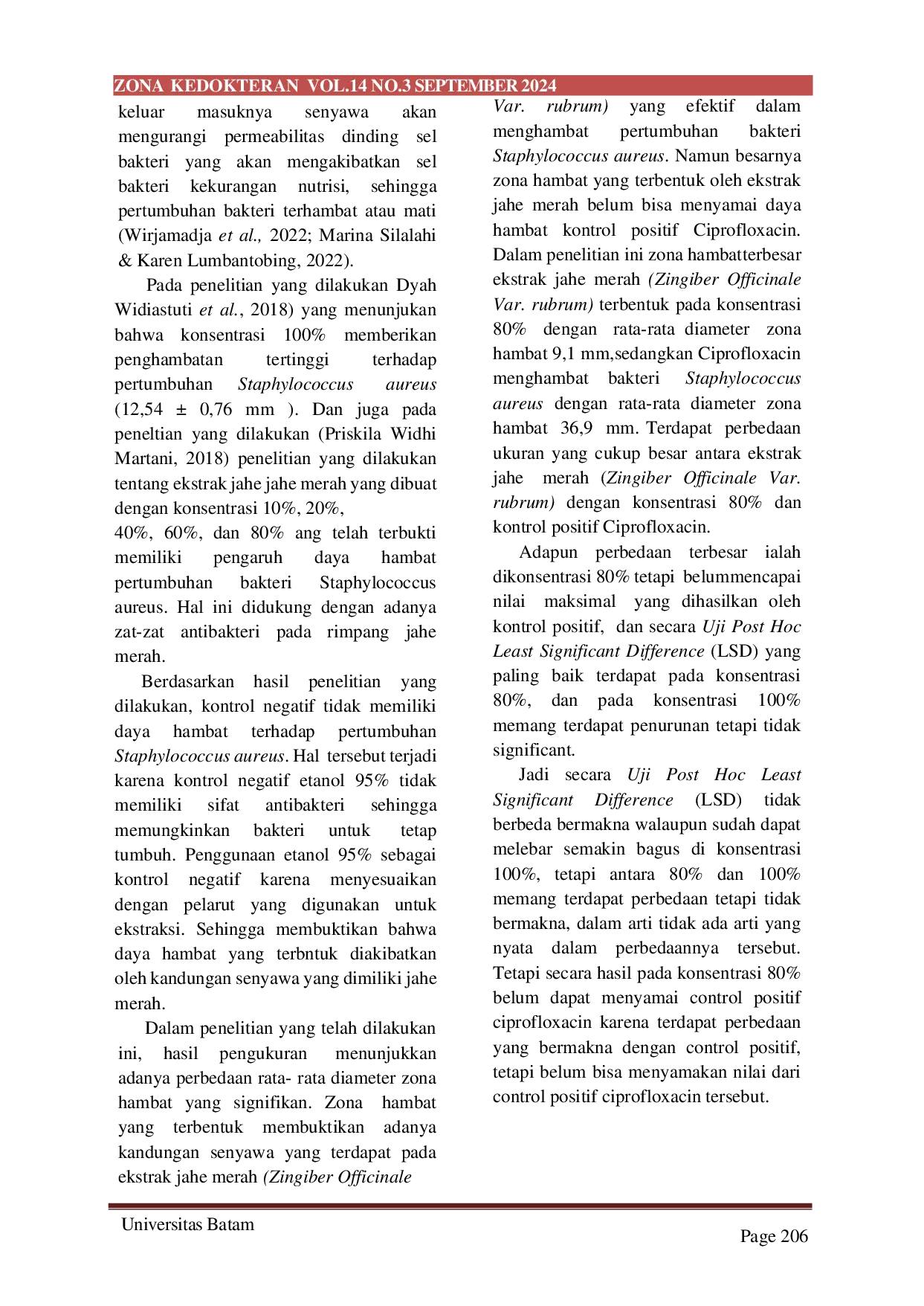 Zona Kedokteran: Program Studi Pendidikan Dokter Universitas BatamZona Kedokteran: Program Studi Pendidikan Dokter Universitas BatamLatar Belakang: Staphylococcus aureus merupakan bakteri patogen oportunistik yang dapat ditemukan di permukaan kulit dan permukaan mukosa di beberapa organ manusia. Jahe merah (Zingiber officinale var. rubrum) mengandung senyawa Flavonoid, Fenol, Terponoid, dan Minyak astiri yang dapat menghambat pertumbuhan bakteri. Penelitian ini bertujuan untuk mengetahui efektivitas ekstrak jahe merah dengan konsentrasi 60%, 80%, dan 100% terhadap pertumbuhan bakteri Staphylococcus aureus.. . Metode: Penelitian ini adalah penelitian eksperimental menggunakan rancangan secara acak dengan tes dan kelompok kontrol (The Randomized Posttest Only Control Group Design). Ekstrak jahe merah diperoleh melalui metode maserasi yang direndam pelarut etanol 95%. Untuk mengetahui efektivitas ekstrak jahe merah terhadap pertumbuhan bakteri Staphylococcus aureus dilakukan uji in vitro dengan metode difusi cakram.. . Hasil: Hasil uji efektivitas ekstrak jahe merah terhadap Staphylococcus aureus menunjukkan adanya zona bening di sekitar kertas cakram yang menandakan terhambatnya pertumbuhan bakteri dengan konsentrasi yang paling efektif adalah 80%.. . Kesimpulan: Berdasarkan hasil penelitian ini diketahui bahwa Ekstrak jahe merah efektif dalam menghambat pertumbuhan Staphylococcus aureus.