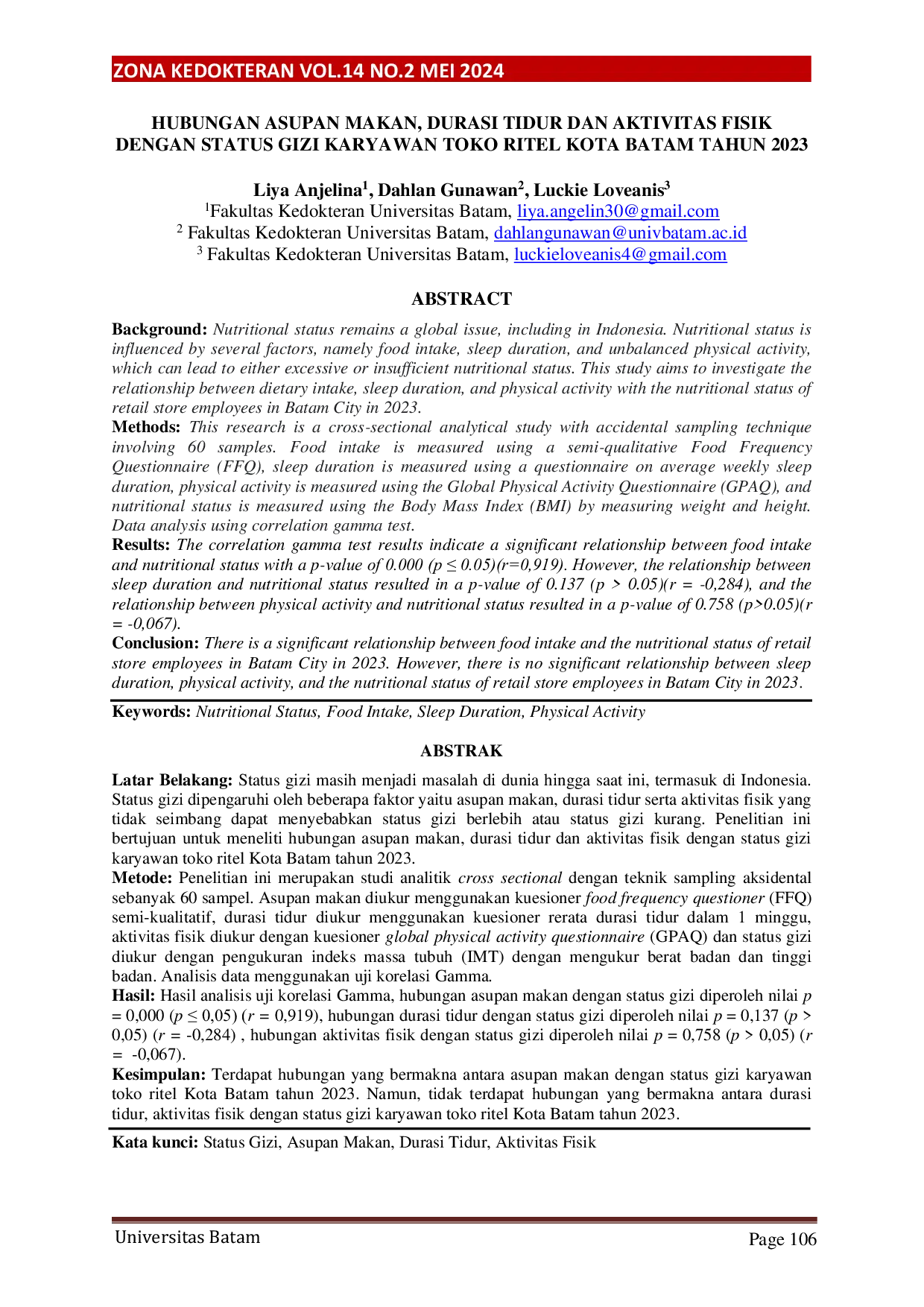 Zona Kedokteran: Program Studi Pendidikan Dokter Universitas BatamZona Kedokteran: Program Studi Pendidikan Dokter Universitas BatamLatar Belakang: Status gizi masih menjadi masalah di dunia hingga saat ini, termasuk di Indonesia. Status gizi dipengaruhi oleh beberapa faktor yaitu asupan makan, durasi tidur serta aktivitas fisik yang tidak seimbang dapat menyebabkan status gizi berlebih atau status gizi kurang. Penelitian ini bertujuan untuk meneliti hubungan asupan makan, durasi tidur dan aktivitas fisik dengan status gizi karyawan toko ritel Kota Batam tahun 2023. Metode: Penelitian ini merupakan studi analitik cross sectional dengan teknik sampling aksidental sebanyak 60 sampel. Asupan makan diukur menggunakan kuesioner food frequency questioner (FFQ) semi-kualitatif, durasi tidur diukur menggunakan kuesioner rerata durasi tidur dalam 1 minggu, aktivitas fisik diukur dengan kuesioner global physical activity questionnaire (GPAQ) dan status gizi diukur dengan pengukuran indeks massa tubuh (IMT) dengan mengukur berat badan dan tinggi badan. Analisis data menggunakan uji korelasi Gamma. Hasil: Hasil analisis uji korelasi Gamma, hubungan asupan makan dengan status gizi diperoleh nilai p = 0,000 (p ≤ 0,05) (r = 0,919), hubungan durasi tidur dengan status gizi diperoleh nilai p = 0,137 (p > 0,05) (r = -0,284) , hubungan aktivitas fisik dengan status gizi diperoleh nilai p = 0,758 (p > 0,05) (r = -0,067). Kesimpulan: Terdapat hubungan yang bermakna antara asupan makan dengan status gizi karyawan toko ritel Kota Batam tahun 2023. Namun, tidak terdapat hubungan yang bermakna antara durasi tidur, aktivitas fisik dengan status gizi karyawan toko ritel Kota Batam tahun 2023.