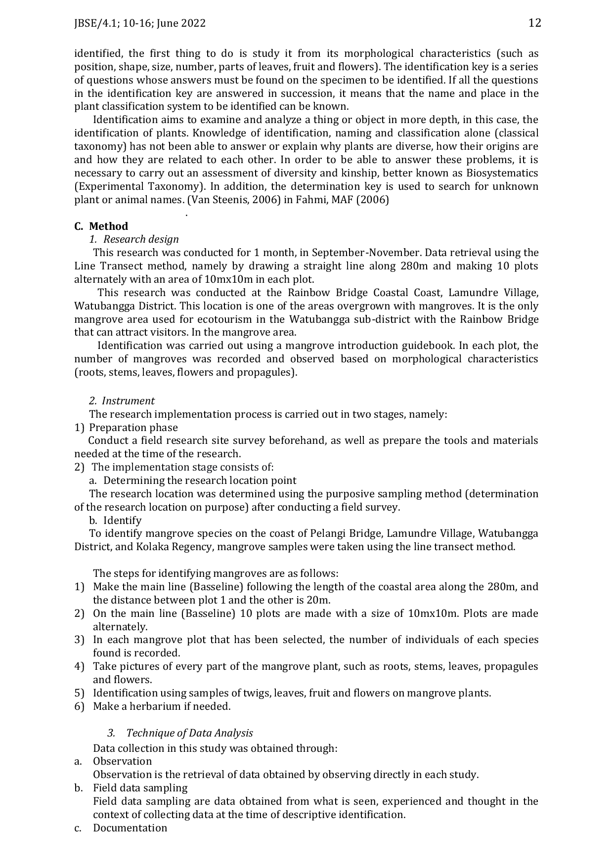 Journal of Biological Science and EducationJournal of Biological Science and EducationDesa Lamundre adalah kawasan yang dilimpahi ekosistem mangrove seluas 4 hektar dan berkembang dengan baik di pesisir pantai. Kawasan ini dapat tumbuh subur dengan mangrove karena kondisi lingkungan dan faktor pendukung lainnya seperti substrat lumpur, pasir lumpur di daerah transisi pasang surut, air asin, air payau, dan adanya arus/gelombang yang dikategorikan sebagai kondisi tumbuh mangrove. Penelitian ini bertujuan untuk mengetahui jenis-jenis tumbuhan mangrove dan parameter lingkungan terhadap kelimpahan spesies mangrove di Pantai Pelangi, Desa Lamundre, Kecamatan Watubangga, Kabupaten Kolaka. Jenis penelitian ini adalah deskriptif dan kualitatif dengan menggunakan sampel mangrove pada bagian akar, batang, daun, bunga, dan buah. Metode yang digunakan adalah Line Transect, yang menggunakan plot yang sejajar pada garis utama (Basseline) yang telah ditentukan di area penelitian sepanjang 280m, dengan jumlah total plot sebanyak 10, dengan setiap plot berukuran 10m x 10m. Berdasarkan hasil penelitian pada identifikasi mangrove di Pantai Pelangi, Desa Lamundre, Kecamatan Watubangga, Kabupaten Kolaka, menunjukkan bahwa mangrove termasuk dalam 2 famili dan 7 spesies. Mangrove tersebut berasal dari famili Rhizophoraceae yaitu spesies Rhizophora mucronata, Rhizophora apiculata, Rhizophora stylosa, Ceriops decandra, Bruguira cyndrica, Bruguira ghymnorryza, dan famili Soneratiaceae yaitu spesies Soneratia caseolaris.