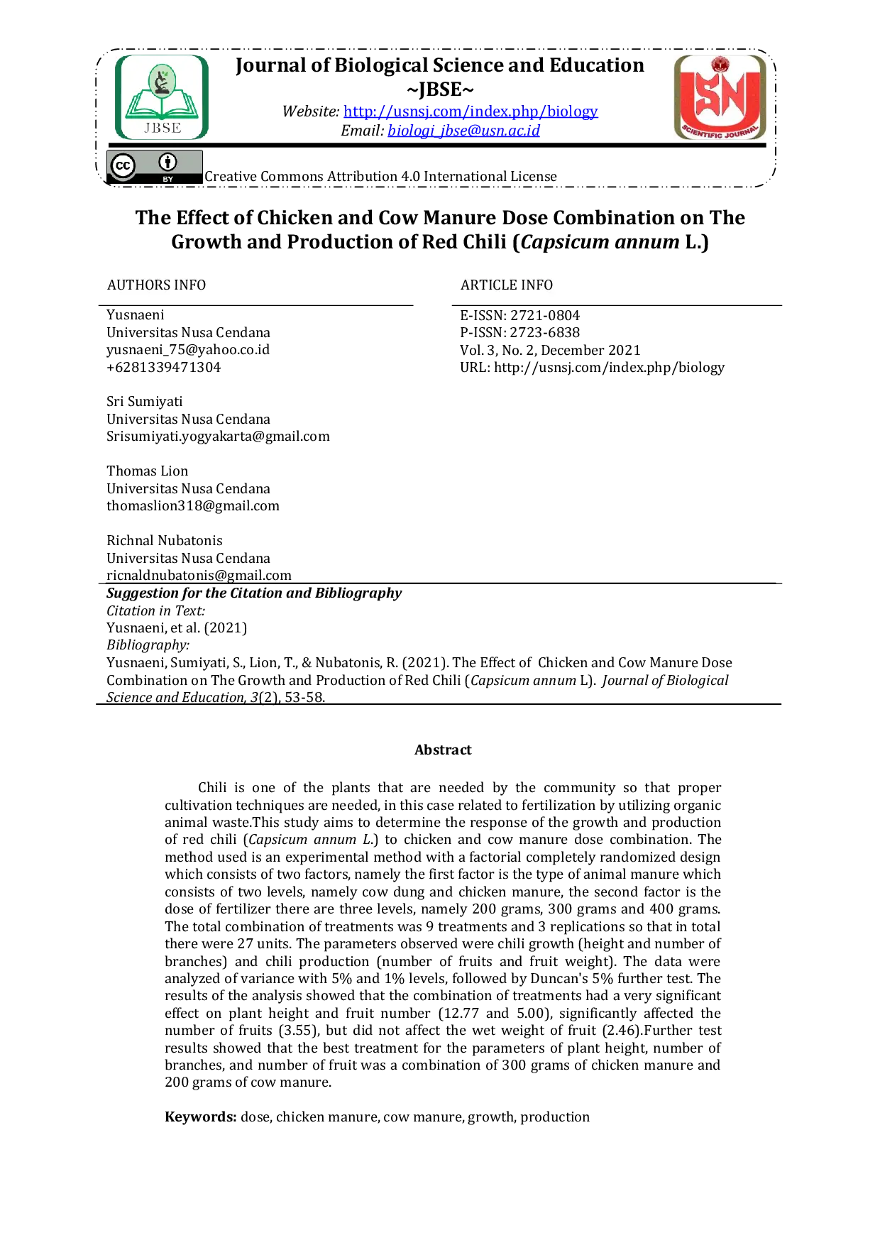 Journal of Biological Science and EducationJournal of Biological Science and EducationCabai merupakan salah satu tanaman yang dibutuhkan oleh masyarakat sehingga diperlukan teknik budidaya yang tepat, dalam hal ini terkait pemupukan dengan memanfaatkan limbah hewan organik. Penelitian ini bertujuan untuk mengetahui respons pertumbuhan dan produksi tanaman cabai merah (Capsicum annum L.) terhadap kombinasi dosis pupuk kandang ayam dan sapi. Metode yang digunakan adalah metode eksperimental dengan rancangan acak lengkap faktorial yang terdiri dari dua faktor, yaitu faktor pertama jenis pupuk kandang yang terdiri dari dua level, yaitu kotoran sapi dan kotoran ayam, faktor kedua adalah dosis pupuk dengan tiga level, yaitu 200 gram, 300 gram, dan 400 gram. Total kombinasi perlakuan adalah 9 dengan 3 ulangan sehingga total unit percobaan menjadi 27. Parameter yang diamati meliputi pertumbuhan tanaman cabai (tinggi tanaman dan jumlah cabang) serta produksi cabai (jumlah buah dan bobot segar buah). Data dianalisis menggunakan analisis ragam pada taraf 5% dan 1%, dilanjutkan dengan uji Duncan 5%. Hasil analisis menunjukkan bahwa kombinasi perlakuan berpengaruh sangat nyata terhadap tinggi tanaman dan jumlah buah (12,77 dan 5,00), berpengaruh nyata terhadap jumlah buah (3,55), namun tidak berpengaruh terhadap bobot segar buah (2,46). Hasil uji lanjut menunjukkan bahwa perlakuan terbaik untuk parameter tinggi tanaman, jumlah cabang, dan jumlah buah adalah kombinasi 300 gram pupuk kandang ayam dan 200 gram pupuk kandang sapi.