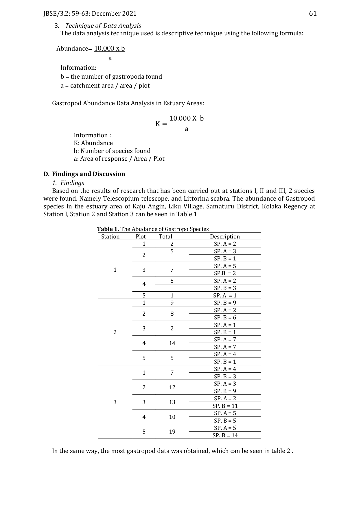 Berdasarkan hasil penelitian yang telah dilakukan di Stasiun I, II, dan III, ditemukan 2 spesies.Kelimpahan spesies Gastropoda di area muara Kaju Angin, Liku Village, Samaturu District, Kolaka Regency pada Stasiun I, Stasiun 2, dan Stasiun 3 dapat dilihat pada Tabel 1.Berdasarkan tabel di atas, diketahui bahwa hasil observasi komunitas Gastropoda di area muara Liku Village, Samaturu District, Kolaka Regency terdiri dari 2 spesies, yaitu Telescopium teleskopium, dan Littorina scabra.Dari data juga diketahui bahwa nilai kelimpahan spesies Gastropoda di area Estuaria, Liku Village, Samaturu District, Kolaka Regency untuk spesies Telescopium teleskopium adalah 30,7 ind/m2 dan Littorina scabra adalah 50 ind/m2.