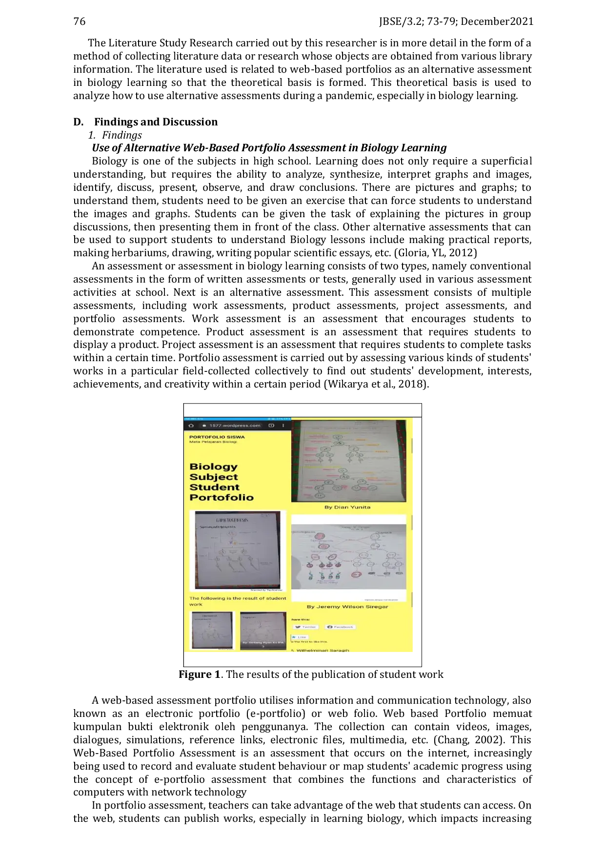 Journal of Biological Science and EducationJournal of Biological Science and EducationPenelitian ini bertujuan untuk menentukan penggunaan portofolio berbasis web sebagai penilaian alternatif dalam pembelajaran biologi. Penelitian ini memperkenalkan portofolio berbasis web sebagai penilaian alternatif dalam pembelajaran biologi. Penilaian alternatif dapat mendukung siswa untuk memahami pelajaran biologi dengan tugas membuat laporan lab, membuat herbarium, menggambar, menulis laporan ilmiah yang tersebar luas, dll. Data yang dikumpulkan dalam bentuk tautan situs web. Metode penelitian yang digunakan adalah studi literatur yang telah dilakukan penulis. Hasil yang diperoleh adalah penggunaan portofolio berbasis web sebagai penilaian alternatif dalam pembelajaran biologi, yang masih belum banyak diterapkan meskipun penilaian ini sangat efisien untuk diterapkan dalam pembelajaran biologi selama pandemi Covid-19. Penelitian ini menyimpulkan bahwa setiap pelajaran yang telah dilakukan tentu saja perlu dinilai pada hasil belajar siswa dalam mengikuti setiap pelajaran yang telah diikuti. Dalam hal ini, penilaian portofolio berbasis web adalah salah satu solusi untuk mengevaluasi kinerja dan pekerjaan siswa sehingga semua kegiatan yang dilakukan dapat dihargai dengan nilai.