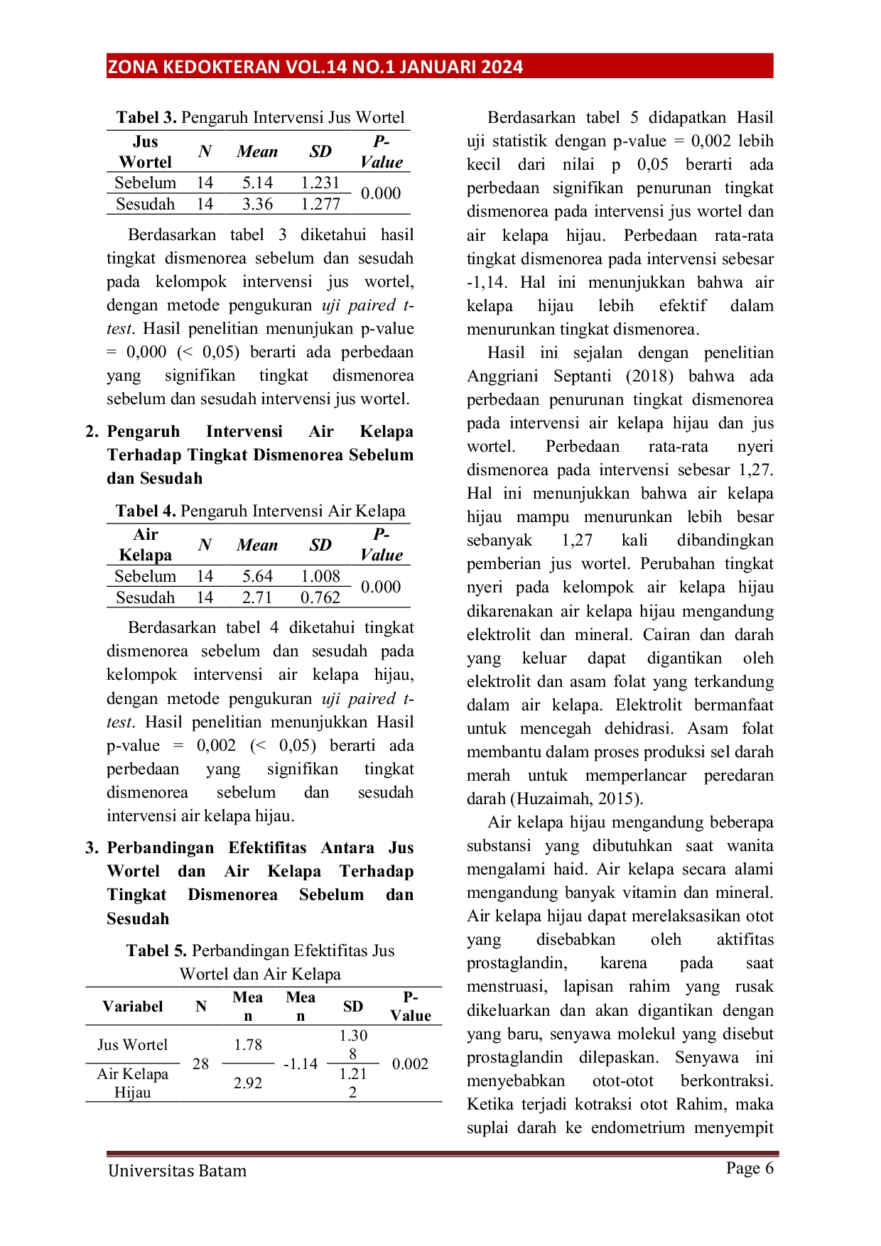 Berdasarkan hasil penelitian ini dapat ditarik kesimpulan bahwa pemberian air kelapa hijau lebih efektif dalam mengurangi nyeri haid dibandingkan pemberian jus wortel pada mahasiswa asrama putri Universitas Batam Tahun 2023.Intervensi air kelapa hijau menunjukkan penurunan tingkat dismenorea dari 5,64 menjadi 2,71, sedangkan jus wortel menunjukkan penurunan dari 5,14 menjadi 3,14.Kedua intervensi memberikan pengaruh signifikan dalam menurunkan tingkat dismenorea.