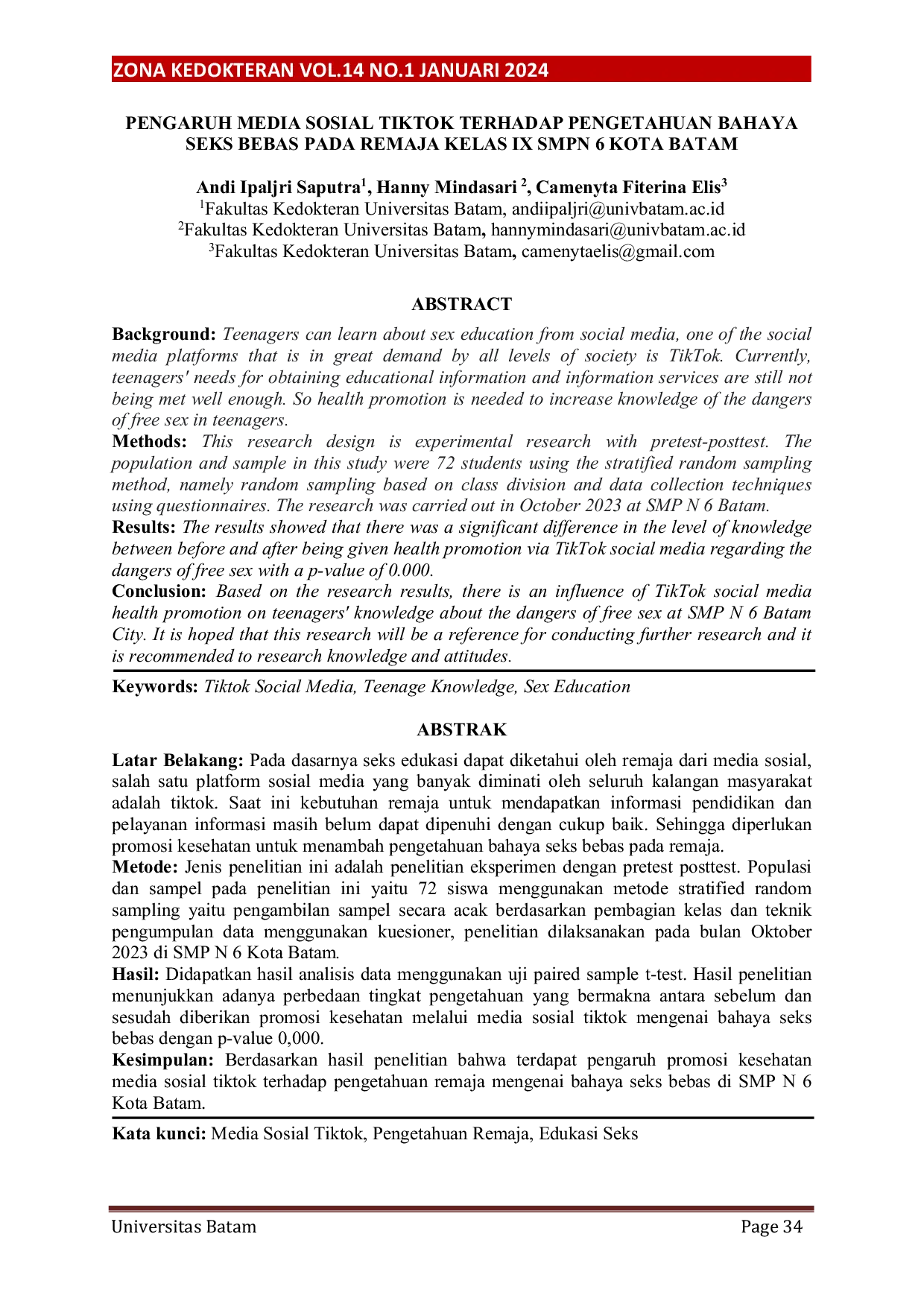Zona Kedokteran: Program Studi Pendidikan Dokter Universitas BatamZona Kedokteran: Program Studi Pendidikan Dokter Universitas BatamRemaja dapat belajar tentang seks edukasi dari media sosial, salah satu platform sosial media yang banyak diminati oleh seluruh kalangan masyarakat adalah tiktok. Saat ini kebutuhan remaja untuk mendapatkan informasi pendidikan dan pelayanan informasi masih belum dapat dipenuhi dengan cukup baik. Sehingga diperlukan promosi kesehatan untuk menambah pengetahuan bahaya seks bebas pada remaja. Jenis penelitian ini adalah penelitian eksperimen dengan pretest posttest. Populasi dan sampel pada penelitian ini yaitu 72 siswa menggunakan metode stratified random sampling yaitu pengambilan sampel secara acak berdasarkan pembagian kelas dan teknik pengumpulan data menggunakan kuesioner, penelitian dilaksanakan pada bulan Oktober 2023 di SMP N 6 Kota Batam. Hasil penelitian menunjukkan adanya perbedaan tingkat pengetahuan yang bermakna antara sebelum dan sesudah diberikan promosi kesehatan melalui media sosial tiktok mengenai bahaya seks bebas dengan p-value 0,000.