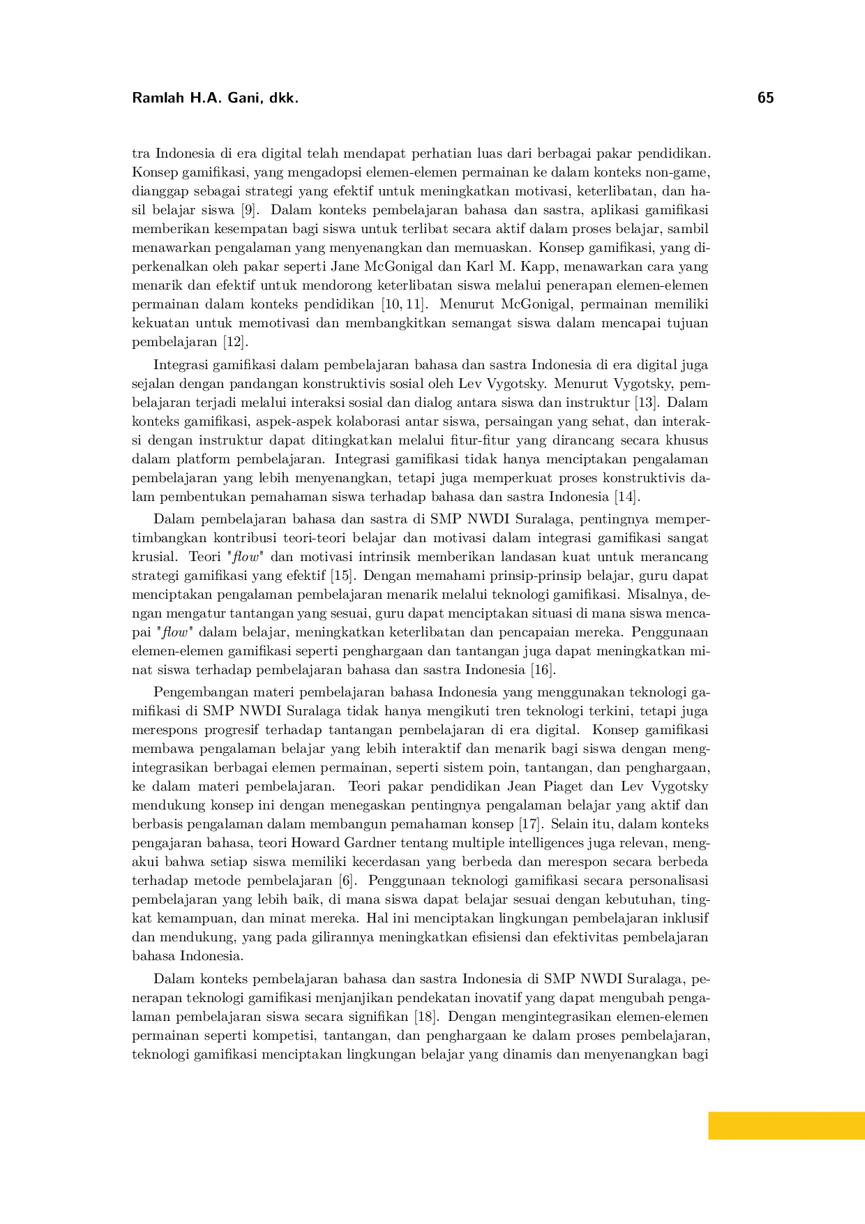 JNANALOKAJNANALOKAMasalah utama yang diidentifikasi adalah tantangan dalam menciptakan lingkungan pembelajaran yang mengembangkan karakter positif pada siswa di era digital. Tujuan penelitian ini adalah untuk mengevaluasi efektivitas teknologi gamifikasi dalam meningkatkan keterlibatan siswa dan hasil pembelajaran bahasa dan sastra. Penelitian ini menggunakan pendekatan kuantitatif dengan melibatkan 50 siswa kelas VIII A dan B sebagai populasi. Data dikumpulkan melalui pre-test dan post-test, serta survei, dan dianalisis menggunakan teknik statistik deskriptif dan komparatif. Hasil penelitian menunjukkan peningkatan signifikan dalam pemahaman siswa tentang bahasa dan sastra setelah penerapan teknologi gamifikasi, dengan nilai prates rata-rata dari Bahasa Indonesia meningkat dari 76.2 menjadi 84.5, dan dari Sastra Indonesia dari 72.8 menjadi 81.3. Faktor-faktor pendukung dan penghambat juga diidentifikasi melalui analisis, termasuk infrastruktur teknologi, keterampilan staf pengajar, serta dukungan dan partisipasi siswa. Hasilnya menunjukkan peningkatan signifikan dari nilai prates (76.2) ke nilai pascates (84.5) pada mata pelajaran Bahasa Indonesia dan dari nilai prates (72.8) ke nilai pascates (81.3) pada mata pelajaran Sastra Indonesia. Temuan ini mengindikasikan efektivitas integrasi Teknologi Gamifikasi dalam meningkatkan hasil belajar siswa. Implikasi penelitian ini adalah bahwa teknologi gamifikasi memiliki potensi untuk menjadi alat yang efektif dalam meningkatkan pembelajaran Bahasa dan Sastra Indonesia di era digital, dengan menyediakan lingkungan pembelajaran yang dinamis dan interaktif bagi siswa. Penelitian ini memberikan pemahaman yang komprehensif tentang potensi dan tantangan integrasi Teknologi Gamifikasi dalam pembelajaran Bahasa dan Sastra Indonesia di era digital, serta memberikan dasar yang kuat untuk pengembangan strategi pembelajaran yang lebih efektif dan menarik.