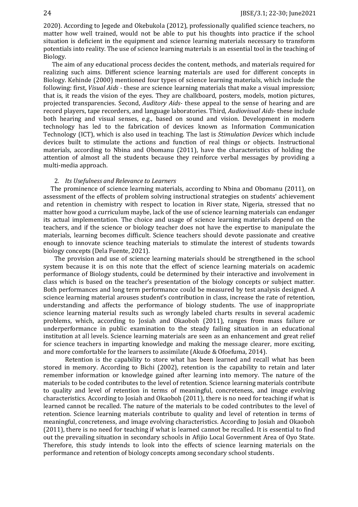 Journal of Biological Science and EducationJournal of Biological Science and EducationThis study investigated the effects of science learning materials on performance and retention of biology concepts among senior high school students in Afijio local government of Oyo State, Nigeria. The study was Quasi-experimental involving pretest, posttest equivalent group design. In this design, 40 students were randomly selected from Senior High School Students 2, pretested to ascertain their group equivalence, and then divided into two groups (experimental and control) using the lottery method of sampling techniques. The experimental group was taught biology concepts with science learning materials, while the control group was taught the same concepts without science learning materials for three weeks. The two groups were pretested and post-tested for performance and retention, respectively. The data collected were analyzed using a simple percentage method, mean, and standard deviation. Based on the data generated and results obtained from the experiment, the findings revealed that the use of science learning materials in the teaching of Biology concepts significantly enhances students retention ability and further improves the academic performance of the senior high school students. Moreover, students who are exposed to science learning materials in teaching biology concepts generally have better academic performance and retention ability than students who were not exposed to the given intervention. The study recommends that the Ministry of Education may consider to provide science learning materials for effective delivery of the teaching and learning process of Biology concepts in the country.