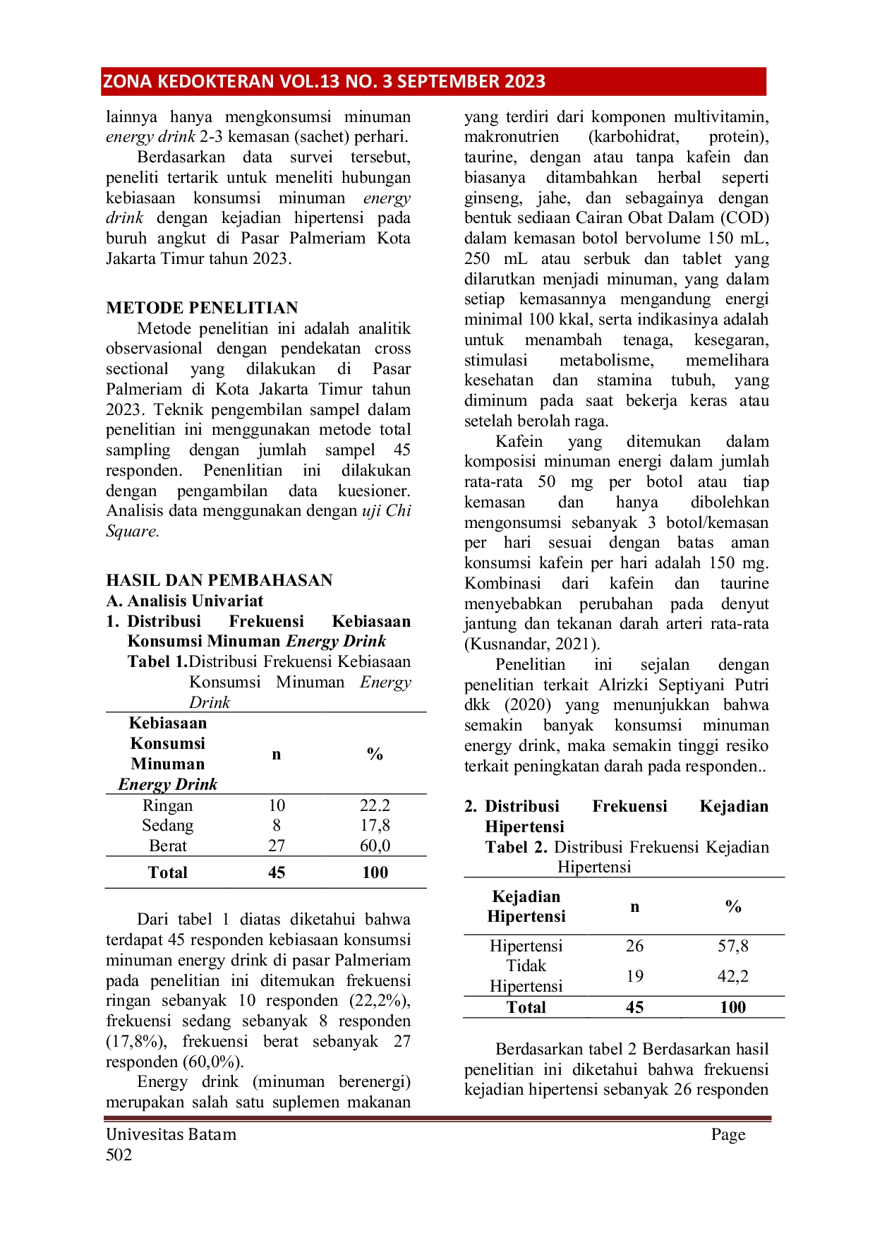 Zona Kedokteran: Program Studi Pendidikan Dokter Universitas BatamZona Kedokteran: Program Studi Pendidikan Dokter Universitas BatamLatar Belakang: Energy drink mengacu pada minuman yang mengandung kafein yang dipadukan dengan bahan lain seperti taurin, guarana, dan vitamin B, yang diklaim dapat memberikan energi ekstra bagi penggunanya. Hasil studi mengenai efek minuman berenergi terhadap subjek yang sehat berusia 18-45 tahun, mengonsumsi minuman berenergi 1-3 kaleng, subjek mengalami peningkatan tekanan darah sistolik rata-rata 3,5 mmHg dan juga memiliki rata-rata perpanjangan 10-msec pada interval QT. Metode: Metode penelitian ini adalah analitik observasional dengan pendekatan cross sectional yang dilakukan di Pasar Palmeriam di Kota Jakarta Timur tahun 2023. Penelitian ini menggunakan metode total sampling dengan jumlah sampel 45 responden dengan pengambilan data kuesioner. Analisis data menggunakan uji Chi Square. Hasil: Hasil penelitian pada 45 responden terdapat hubungan bermakna antara mengkonsumsi energy drink dengan kejadian hipertensi pada buruh angkut di Pasar Palmeriam di Kota Jakarta Timur Tahun 2023. Dari hasil uji Chi Square didapatkan p-value sebesar 0,000 sehingga H0 ditolak dan Ha diterima. Simpulan: Berdasarkan hasil penelitian ini dapat disimpulkan adanya hubungan yang bermakna antara mengkonsumsi energy drink dengan kejadian hipertensi pada buruh angkut di Pasar Palmeriam di Kota Jakarta Timur Tahun 2023.