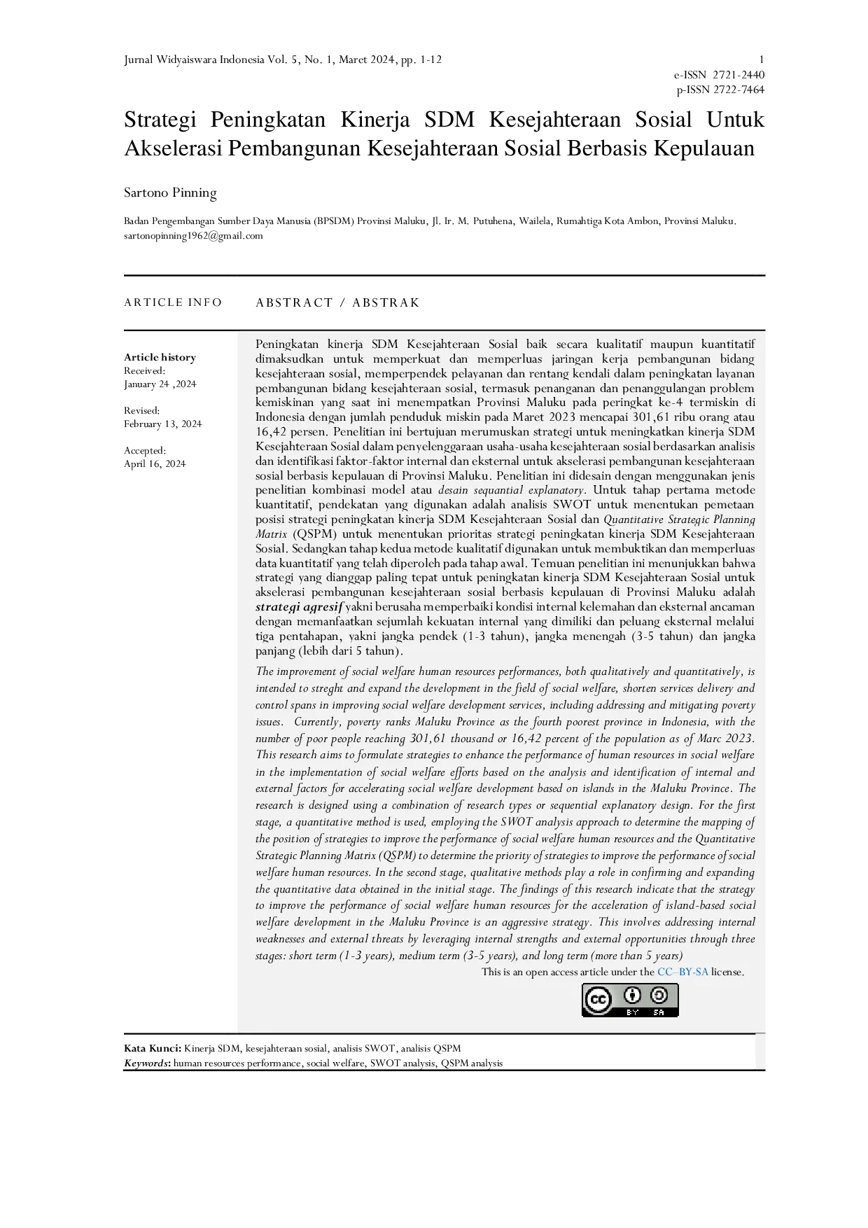 jurnal widyaiswara indonesiajurnal widyaiswara indonesiaPenelitian ini bertujuan merumuskan strategi untuk meningkatkan kinerja SDM Kesejahteraan Sosial dalam penyelenggaraan usaha-usaha kesejahteraan sosial berdasarkan analisis dan identifikasi faktor-faktor internal dan eksternal untuk akselerasi pembangunan kesejahteraan sosial berbasis kepulauan di Provinsi Maluku. Penelitian ini menggunakan pendekatan penelitian kombinasi model atau desain sequential explanatory. Temuan penelitian menunjukkan bahwa strategi yang dianggap paling tepat adalah strategi agresif, yakni berusaha memperbaiki kondisi internal kelemahan dan eksternal ancaman dengan memanfaatkan sejumlah kekuatan internal yang dimiliki dan peluang eksternal melalui tiga tahapan: jangka pendek (1-3 tahun), jangka menengah (3-5 tahun) dan jangka panjang (lebih dari 5 tahun).