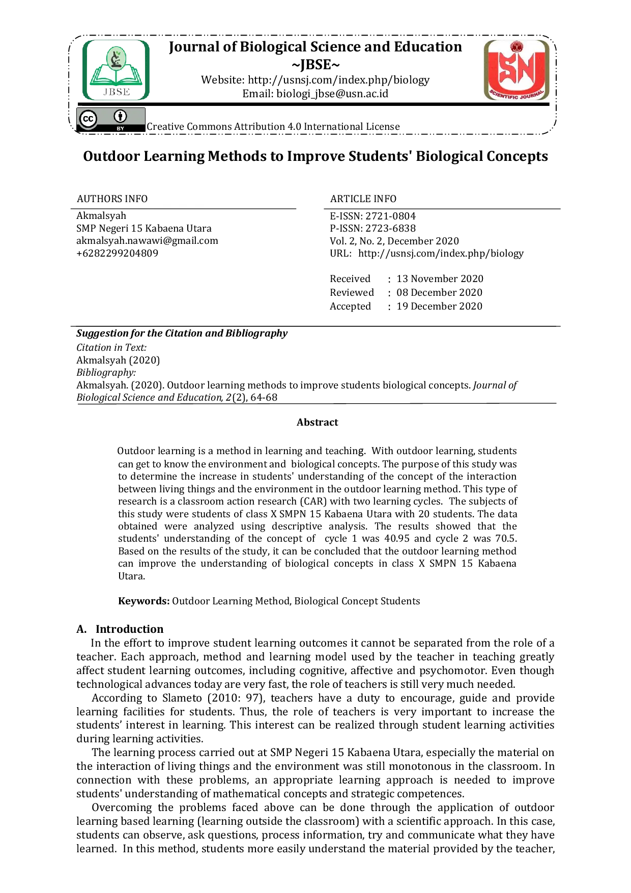 Journal of Biological Science and EducationJournal of Biological Science and EducationPembelajaran outdoor adalah metode dalam belajar dan mengajar. Dengan pembelajaran outdoor, siswa dapat mengenal lingkungan dan konsep biologis. Tujuan penelitian ini adalah untuk menentukan peningkatan pemahaman siswa tentang konsep interaksi antara makhluk hidup dan lingkungan dalam metode pembelajaran outdoor. Jenis penelitian ini adalah penelitian tindakan kelas (PTK) dengan dua siklus belajar. Subjek penelitian ini adalah siswa kelas X SMPN 15 Kabaena Utara dengan 20 siswa. Data yang diperoleh dianalisis menggunakan analisis deskriptif. Hasil menunjukkan bahwa pemahaman konsep siswa pada siklus 1 adalah 40,95 dan siklus 2 adalah 70,5. Berdasarkan hasil penelitian, dapat disimpulkan bahwa metode pembelajaran outdoor dapat meningkatkan pemahaman konsep biologis di kelas X SMPN 15 Kabaena Utara.
