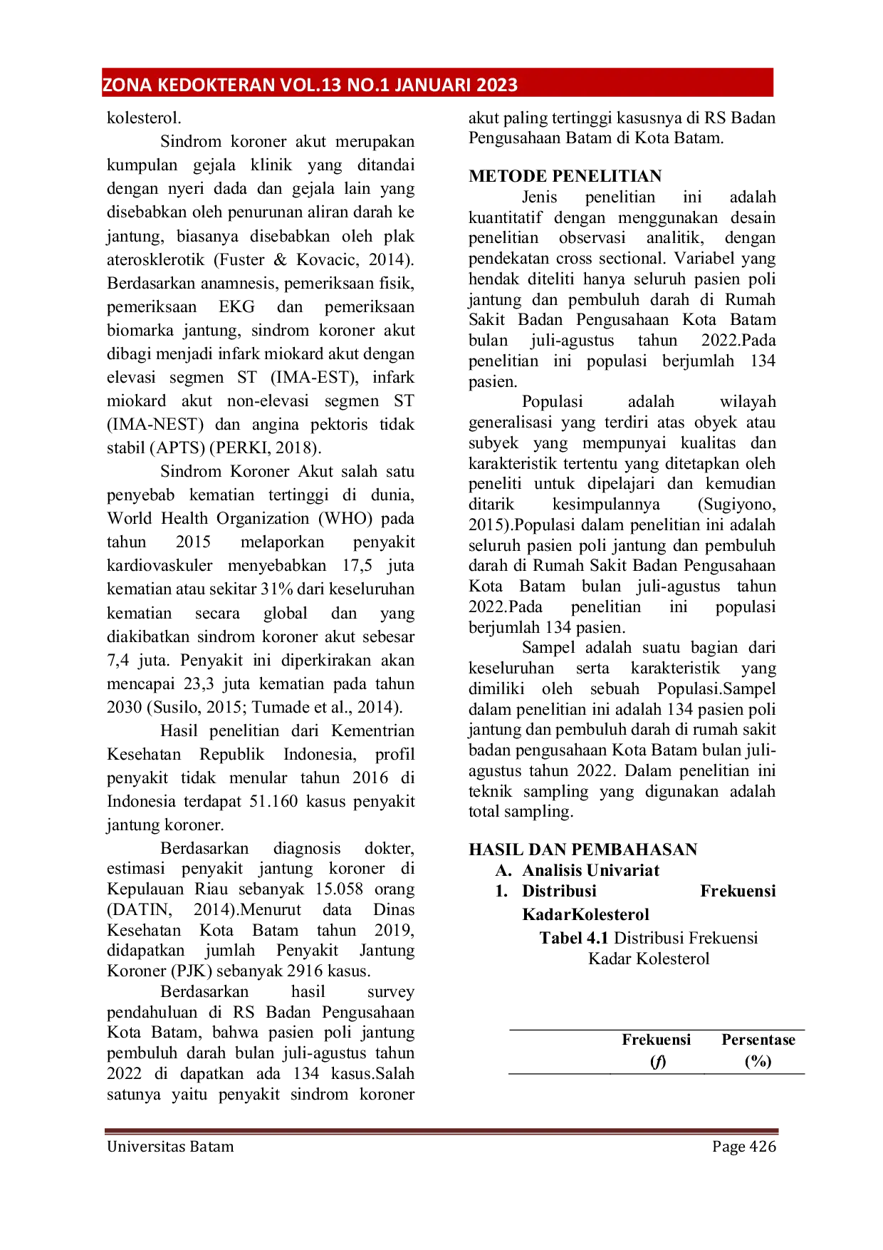 Berdasarkan hasil penelitian ini dapat disimpulkan bahwa terdapat hubungan yang bermakna antara kadar kolesterol dengan sindrom koroner akut di Rumah Sakit Badan Pengusahaan Kota Batam Tahun 2022.Lebih dari setengah (54,5%) pasien yang kadar kolesterolnya tidak beresiko.Lebih dari setengah (57,5%) pasien tidak mengalami Sindrom Koroner Akut.
