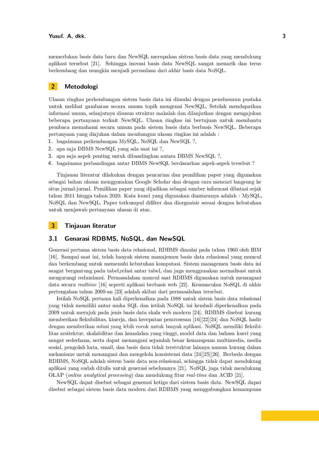 Basis data NewSQL dirancang untuk menggabungkan keunggulan sistem relasional tradisional dan skalabilitas NoSQL dengan tetap mendukung ACID, SQL, dan kinerja tinggi.Tidak ada satu sistem NewSQL yang unggul di semua aspek.Apache Trafodion dan VoltDB menjadi sistem dengan skor terendah pada beberapa aspek, sehingga perlu penelitian lebih lanjut terutama dalam implementasi di platform cloud.