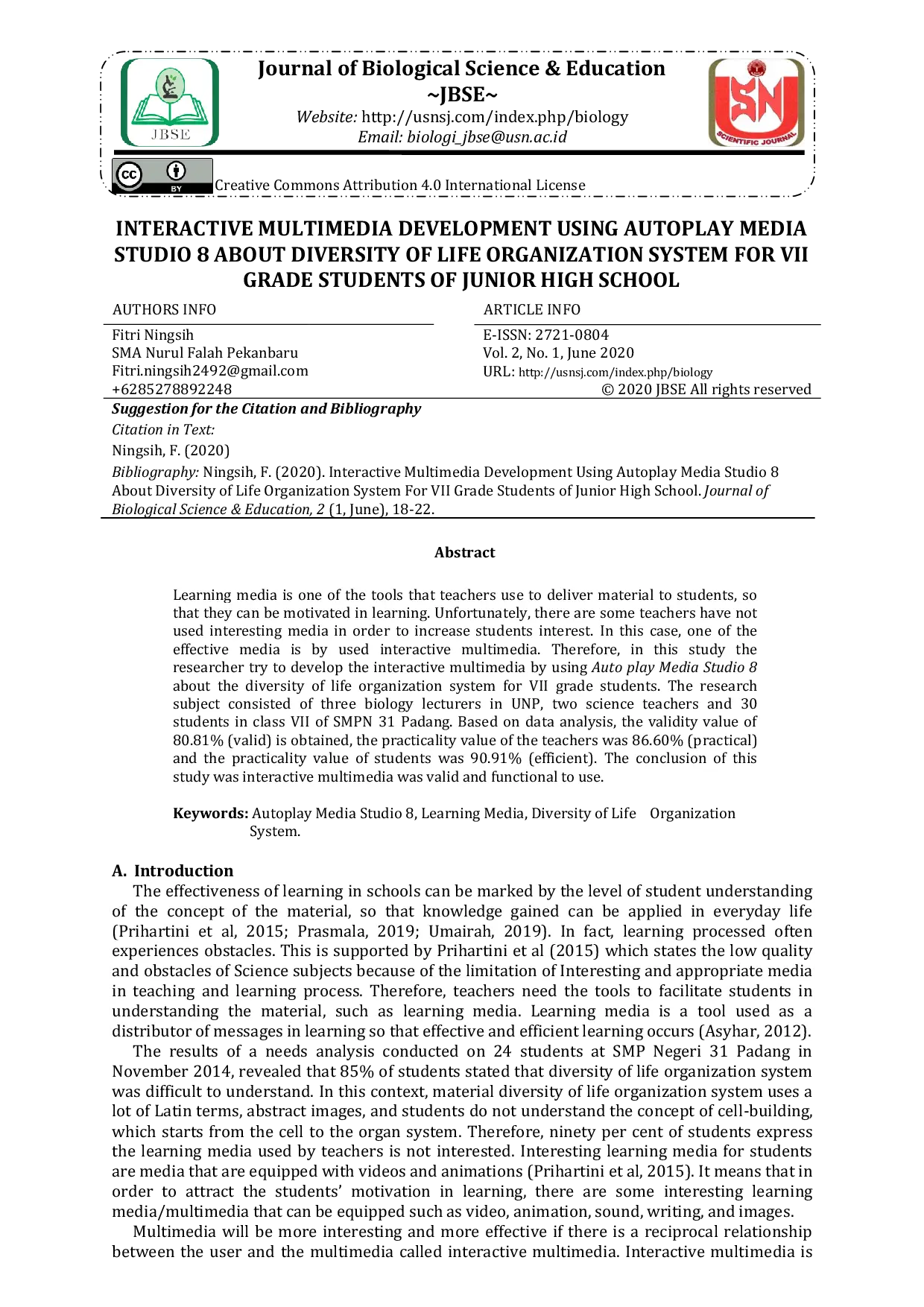 Journal of Biological Science and EducationJournal of Biological Science and EducationPembelajaran media merupakan salah satu alat yang digunakan guru untuk menyampaikan materi kepada siswa, sehingga mereka dapat termotivasi dalam belajar. Sayangnya, beberapa guru belum menggunakan media yang menarik untuk meningkatkan minat siswa. Dalam hal ini, salah satu media yang efektif adalah penggunaan multimedia interaktif. Oleh karena itu, dalam penelitian ini, peneliti mencoba mengembangkan multimedia interaktif menggunakan Auto play Media Studio 8 tentang keragaman sistem organisasi kehidupan untuk siswa kelas VII. Subjek penelitian terdiri dari tiga dosen biologi di UNP, dua guru ilmu pengetahuan alam, dan 30 siswa kelas VII di SMPN 31 Padang. Berdasarkan analisis data, diperoleh nilai validitas 80,81% (valid), nilai kepraktisan guru 86,60% (praktis) dan nilai kepraktisan siswa 90,91% (efisien). Kesimpulan dari penelitian ini adalah multimedia interaktif valid dan fungsional untuk digunakan.