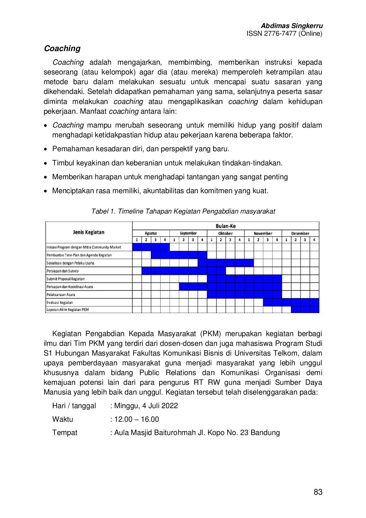 SINGKERRUSINGKERRURukun Warga (RW) dan Rukun Tetangga (RT) merupakan lembaga yang sangat dekat dengan masyarakat karena dipilih langsung oleh masyarakat dan berfungsi dalam pemeliharaan keamanan, ketertiban, kerukunan, serta penggerak swadaya dan partisipasi masyarakat. Pelatihan ini bertujuan untuk meningkatkan kompetensi pengurus RT/RW dalam menjalankan tugasnya. Metode yang digunakan adalah pelatihan dengan presentasi dari narasumber dan coaching, serta diskusi kasus dan analisis krisis organisasi. Peserta dibekali untuk melaksanakan komunikasi organisasi dalam aktivitas kerja RT/RW agar terbangun organisasi yang sehat dan kuat.