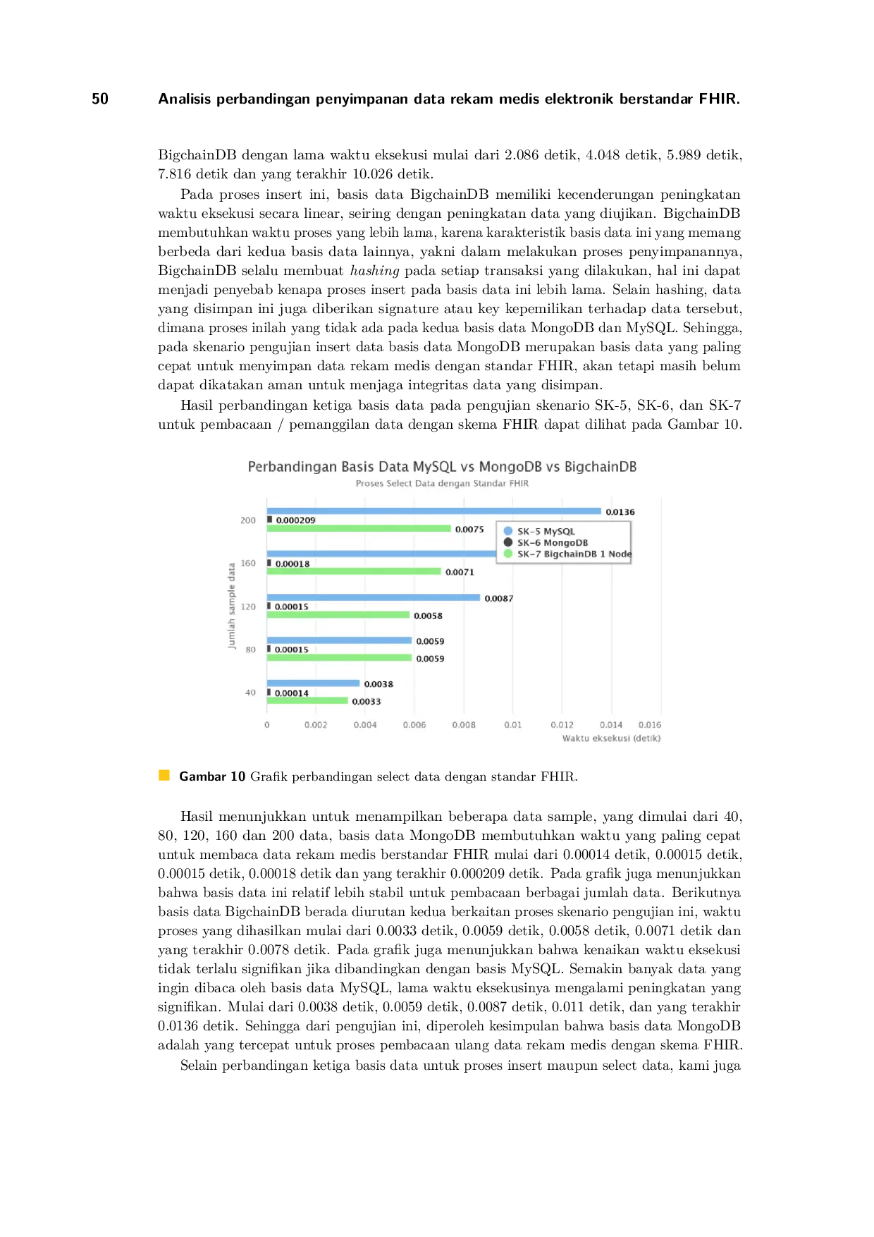 JNANALOKAJNANALOKAKetersediaan data rekam medis dapat memengaruhi pelayanan kesehatan yang diberikan, mulai dari perencanaan perawatan, terapi, hingga fasilitas kesehatan kepada pasien. Integritas data rekam medis elektronik perlu dijaga, salah satunya dengan menerapkan sistem basis data desentralisasi berbasis blockchain. Selain itu, standarisasi data dalam bidang kesehatan juga penting untuk memudahkan integrasi dengan sistem lain, salah satunya menggunakan standar internasional FHIR (Fast Healthcare Interoperability Resources). Penelitian ini menggabungkan BigchainDB dan FHIR untuk menyimpan data rekam medis elektronik. Hasil menunjukkan bahwa BigchainDB membutuhkan waktu pemrosesan lebih lama dibandingkan MongoDB dan MySQL dalam penyimpanan data, namun waktu pembacaan data tidak jauh berbeda dengan MongoDB. Basis data MongoDB terbukti paling efektif dan efisien untuk menyimpan serta membaca data rekam medis dengan skema FHIR, meskipun memerlukan konfigurasi lebih lanjut untuk mencapai fitur desentralisasi seperti pada BigchainDB. MySQL memiliki kecepatan penyimpanan lebih baik dari BigchainDB, tetapi memerlukan konfigurasi replikasi untuk mendukung fitur desentralisasi.