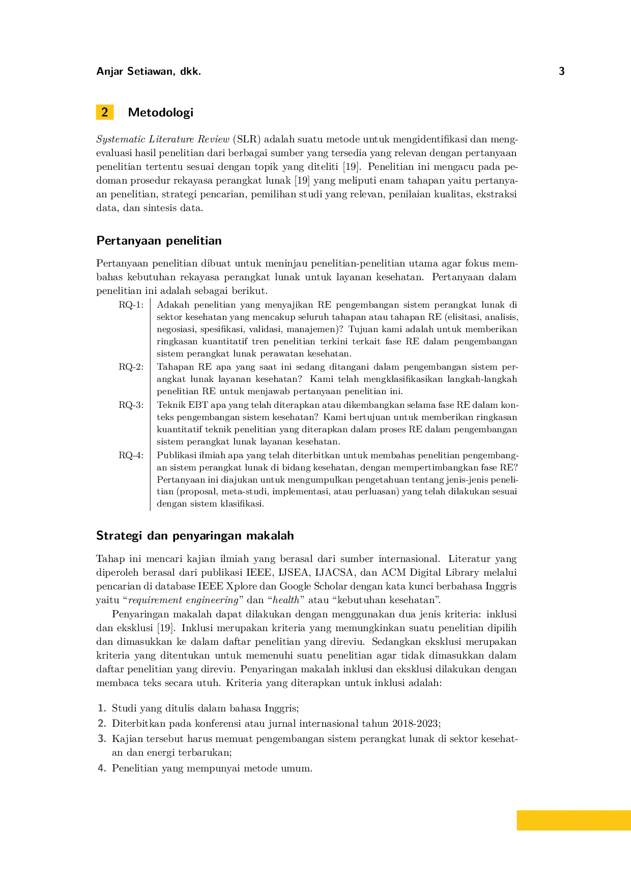 Penelitian ini menyimpulkan bahwa studi mengenai rekayasa kebutuhan pada sektor pelayanan kesehatan masih sangat terbatas, dan hasil pengembangannya masih memerlukan validasi implementasi di dunia nyata.Tinjauan literatur menunjukkan bahwa penelitian yang ada umumnya belum mengimplementasikan seluruh tahapan rekayasa kebutuhan dalam proyek pengembangan sistem kesehatan.Oleh karena itu, penelitian lebih lanjut diperlukan untuk mengembangkan pendekatan rekayasa kebutuhan yang lebih efektif dan efisien dalam pengembangan sistem perangkat lunak untuk layanan kesehatan, terutama dalam topik pencatatan data kesehatan digital.