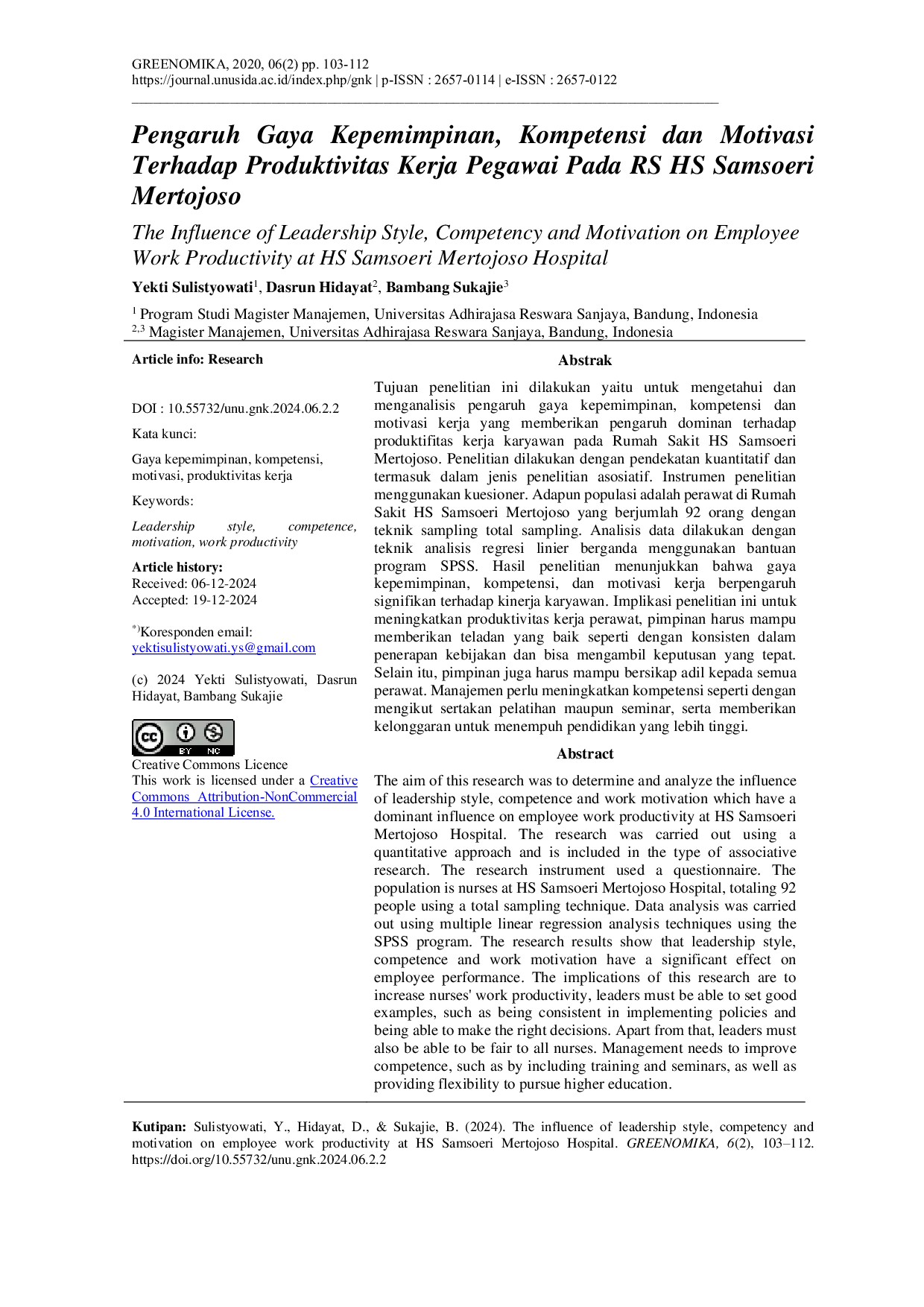 GREENOMIKAGREENOMIKAPenelitian ini bertujuan untuk mengetahui dan menganalisis pengaruh gaya kepemimpinan, kompetensi, dan motivasi kerja yang memberikan pengaruh dominan terhadap produktivitas kerja karyawan pada Rumah Sakit HS Samsoeri Mertojoso. Penelitian dilakukan dengan pendekatan kuantitatif dan termasuk dalam jenis penelitian asosiatif. Instrumen penelitian menggunakan kuesioner. Populasi adalah perawat di Rumah Sakit HS Samsoeri Mertojoso yang berjumlah 92 orang dengan teknik sampling total sampling. Analisis data dilakukan dengan teknik analisis regresi linier berganda menggunakan program SPSS. Hasil penelitian menunjukkan bahwa gaya kepemimpinan, kompetensi, dan motivasi kerja berpengaruh signifikan terhadap kinerja karyawan. Implikasi penelitian ini untuk meningkatkan produktivitas kerja perawat, pimpinan harus mampu memberikan teladan yang baik seperti dengan konsisten dalam penerapan kebijakan dan bisa mengambil keputusan yang tepat. Selain itu, pimpinan juga harus mampu bersikap adil kepada semua perawat. Manajemen perlu meningkatkan kompetensi seperti dengan mengikut sertakan pelatihan maupun seminar, serta memberikan kelonggaran untuk menempuh pendidikan yang lebih tinggi.