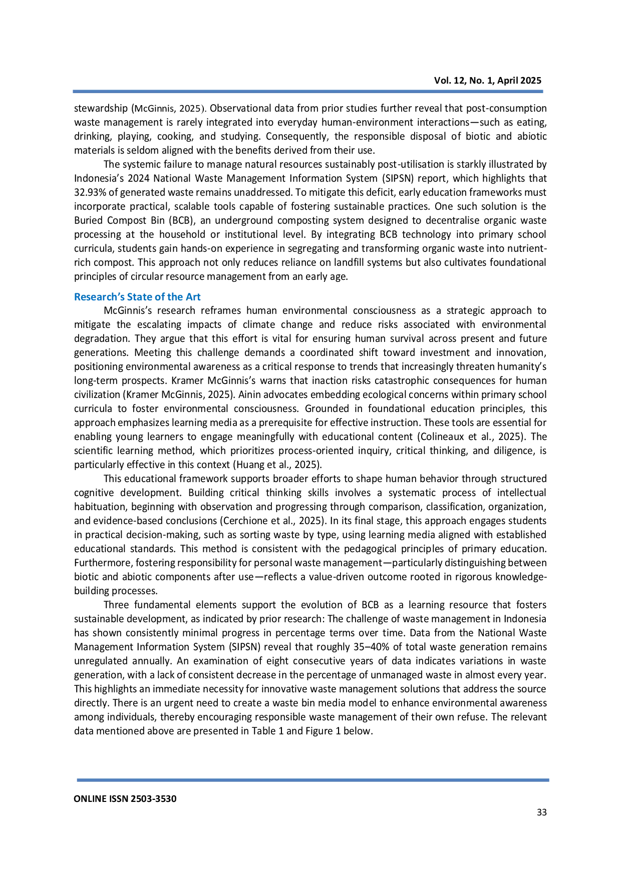 Untuk penelitian lanjutan, disarankan untuk mengembangkan alat dan teknik pendukung yang memfasilitasi metode pemasangan yang lebih fleksibel dan mudah diakses untuk media BCB. Selain itu, perlu dilakukan penelitian lebih lanjut tentang efektivitas media BCB di daerah rawan banjir. Terakhir, penting untuk mengeksplorasi bagaimana kebijakan pemerintah tentang pengelolaan sampah di sekolah dasar dapat diintegrasikan dengan program nasional lainnya, seperti upaya menuju Indonesia bebas sampah pada tahun 2045.