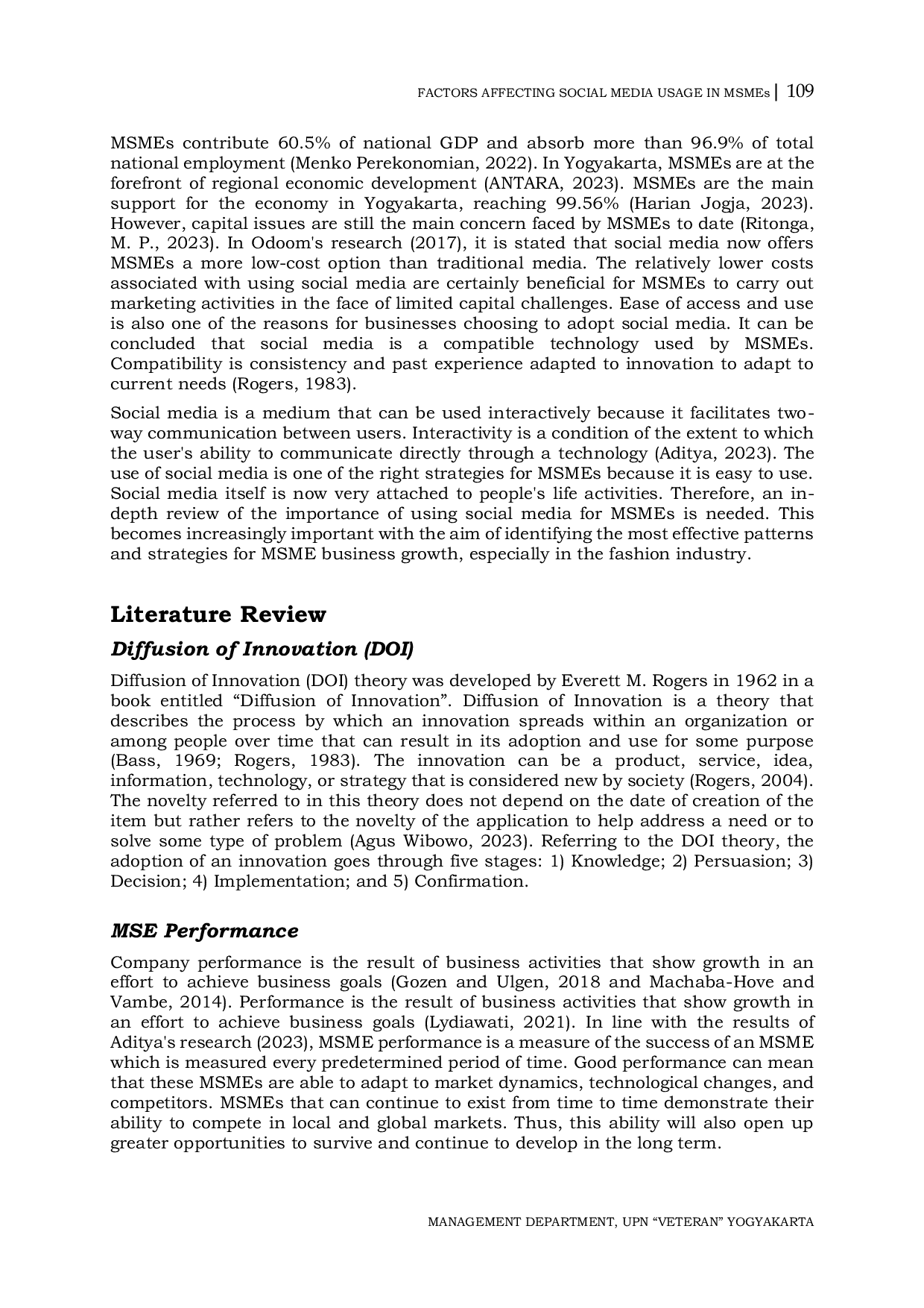 Journal of Business and Organization ManagementJournal of Business and Organization ManagementPenelitian ini bertujuan untuk mengetahui faktor kompatibilitas, efektivitas biaya, dan interaktivitas yang memengaruhi penggunaan media sosial serta dampaknya terhadap kinerja UMKM fashion di Kota Yogyakarta. Fenomena utama dalam penelitian ini adalah persaingan bisnis di Indonesia yang terus meningkat dari tahun ke tahun, sehingga menuntut UMKM untuk senantiasa menjaga eksistensi dan meningkatkan kinerjanya. Perkembangan inovasi teknologi juga mendorong UMKM agar adaptif untuk tetap bersaing dalam persaingan bisnis yang ketat. Metode penelitian menggunakan analisis deskriptif dan kuantitatif. Populasi penelitian adalah UMKM fashion di Kota Yogyakarta. Pengumpulan data dilakukan melalui penyebaran kuesioner via Google Forms kepada 96 UMKM fashion di Kota Yogyakarta. Metode analisis data menggunakan Partial Least Square (SEM-PLS). Hasil analisis menunjukkan bahwa: 1) kompatibilitas berpengaruh positif dan signifikan terhadap penggunaan media sosial, 2) efektivitas biaya berpengaruh positif terhadap penggunaan media sosial, 3) interaktivitas berpengaruh positif dan signifikan terhadap penggunaan media sosial, 4) penggunaan media sosial berpengaruh positif terhadap kinerja UMKM.