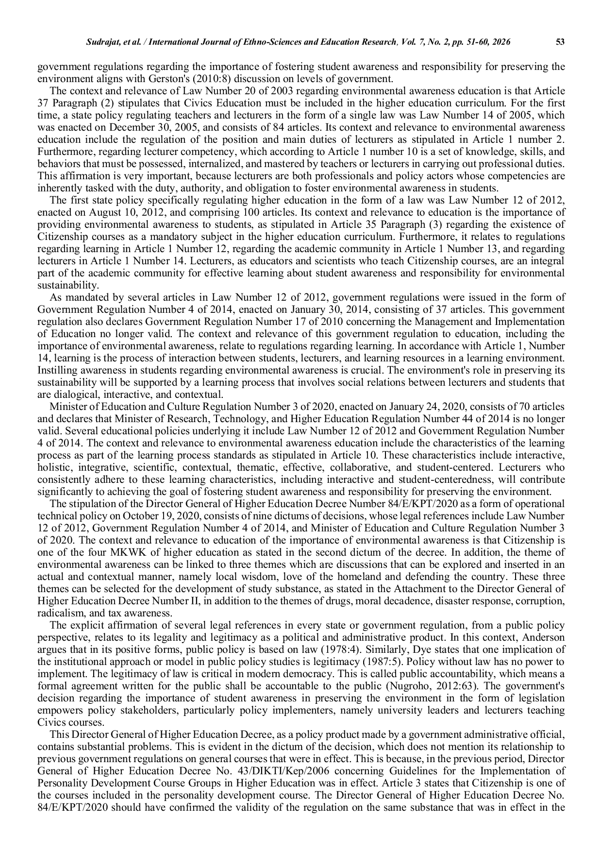 International Journal of Ethno-Sciences and Education ResearchInternational Journal of Ethno-Sciences and Education ResearchIndonesia saat ini menghadapi kerusakan lingkungan yang serius, yang secara signifikan mengganggu keberlanjutan pembangunan nasional. Mahasiswa memainkan peran penting dalam upaya konservasi lingkungan dengan meningkatkan kesadaran akan pelestarian lingkungan. Kebijakan pemerintah, seperti Surat Keputusan Direktur Jenderal Pendidikan Tinggi (Kepdirjen Dikti) Nomor 84/E/KPT/2020 dan beberapa peraturan negara dan pemerintah lainnya, merupakan kebijakan publik di bidang pendidikan yang dapat berkontribusi pada keberlanjutan lingkungan. Penelitian ini bertujuan untuk menganalisis profil, konteks, dan substansi kebijakan negara dan pemerintah tentang mata kuliah Kewarganegaraan, yang relevan dengan upaya keberlanjutan lingkungan dari perspektif kebijakan publik dan pendidikan. Penelitian ini menggunakan metode yuridis normatif, kualitatif, dan studi literatur. Metode yuridis normatif memeriksa substansi peraturan pemerintah, sementara metode kualitatif menggunakan wawancara dengan beberapa dosen dan mahasiswa sebagai informan. Studi literatur memeriksa semua sumber dan dokumen yang relevan dalam berbagai bentuk.