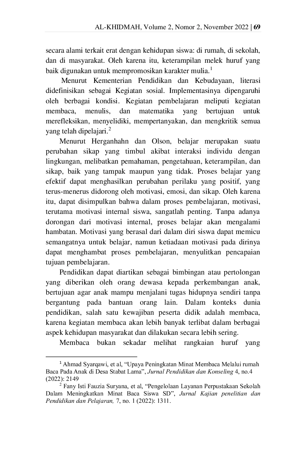 Al-Khidmah : Jurnal Pengabdian dan Pendampingan MasyarakatAl-Khidmah : Jurnal Pengabdian dan Pendampingan MasyarakatPenelitian ini bertujuan untuk menganalisis peran guru dalam mengembangkan minat literasi di Sekolah Dasar Negeri 21 Usaha Jaya. Penelitian ini menggunakan metode kualitatif deskriptif dengan pendekatan studi kasus. Teknik pengumpulan data dilakukan dengan wawancara, observasi, dan dokumentasi terhadap kepala sekolah, guru, dan peserta didik. Hasil penelitian ini adalah menganalisis peran guru dalam mengembangkan minat literasi siswa, termasuk strategi dan pendekatan yang digunakan. Ini akan memberikan pemahaman yang mendalam tentang peran guru dalam mengembangkan dan meningkatkan upaya dalam mengembangkan minat literasi siswa di SD Negeri 21 Usaha Jaya. Sesuai hasil penelitian dapat ditinjau bahwa (1) kegiatan literasi berperan dalam meningkatkan minat membaca peserta didik, (2) kendala dalam melaksanakan kegiatan literasi di sekolah antara lain adalah kurangnya sarana prasarana, peran orang tua, metode yang diterapkan kurang variatif serta rendahnya kedisiplinan siswa dalam proses pembiasaan aktivitas literasi, dan (3) usaha yang dilakukan pihak sekolah dalam mengatasi kendala tersebut adalah dengan memberikan sosialisasi tentang aktivitas literasi, menambah sarana serta mengadakan kegiatan bimbingan belajar sebagai sarana partisipasi aktif peserta didik.