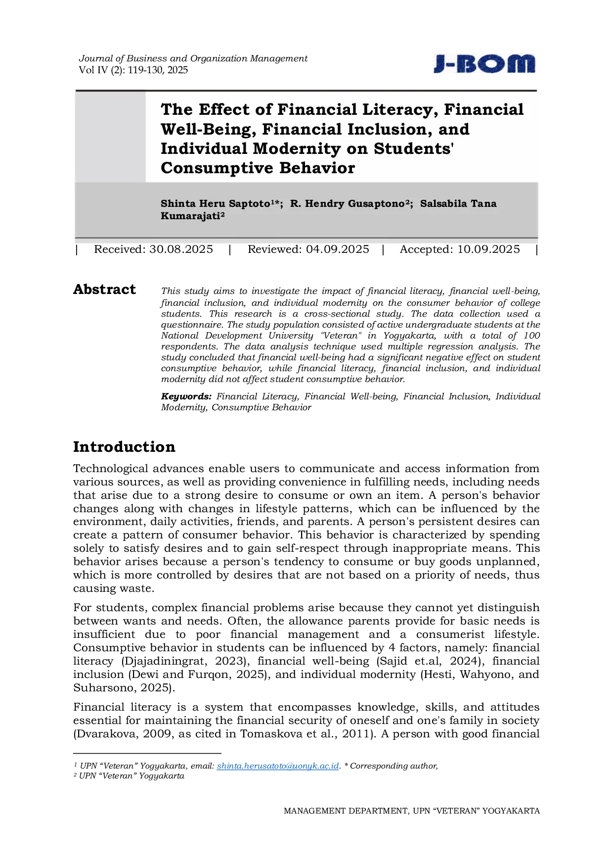 Journal of Business and Organization ManagementJournal of Business and Organization ManagementPenelitian ini bertujuan untuk menyelidiki dampak literasi keuangan, kesejahteraan keuangan, inklusi keuangan, dan modernitas individu terhadap perilaku konsumen mahasiswa. Penelitian ini merupakan studi lintas-seksi. Pengumpulan data menggunakan kuesioner. Populasi penelitian terdiri dari mahasiswa aktif di Universitas Pembangunan Nasional Veteran Yogyakarta, dengan total 100 responden. Teknik analisis data menggunakan analisis regresi berganda. Penelitian menyimpulkan bahwa kesejahteraan keuangan memiliki efek negatif signifikan terhadap perilaku konsumtif mahasiswa, sedangkan literasi keuangan, inklusi keuangan, dan modernitas individu tidak mempengaruhi perilaku konsumtif mahasiswa.