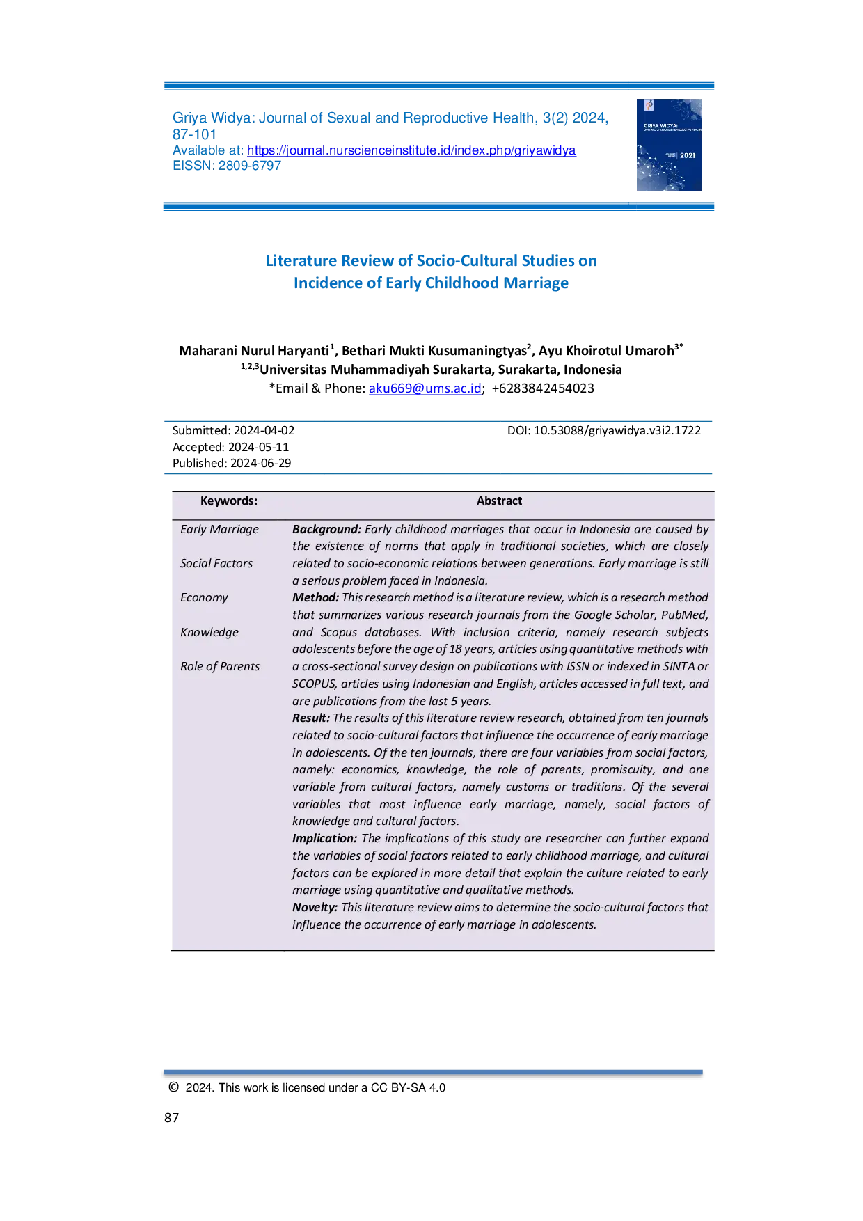 Griya Widya: Journal of Sexual and Reproductive HealthGriya Widya: Journal of Sexual and Reproductive HealthEarly childhood marriages that occur in Indonesia are caused by the existence of norms that apply in traditional societies, which are closely related to socio-economic relations between generations. Early marriage is still a serious problem faced in Indonesia. This research method is a literature review, which is a research method that summarizes various research journals from the Google Scholar, PubMed, and Scopus databases. The inclusion criteria are research subjects adolescents before the age of 18 years, articles using quantitative methods with a cross-sectional survey design on publications with ISSN or indexed in SINTA or SCOPUS, articles using Indonesian and English, articles accessed in full text, and are publications from the last 5 years. The results of this literature review research, obtained from ten journals related to socio-cultural factors that influence the occurrence of early marriage in adolescents. Of the ten journals, there are four variables from social factors, namely: economics, knowledge, the role of parents, promiscuity, and one variable from cultural factors, namely customs or traditions. Of the several variables that most influence early marriage, namely, social factors of knowledge and cultural factors.