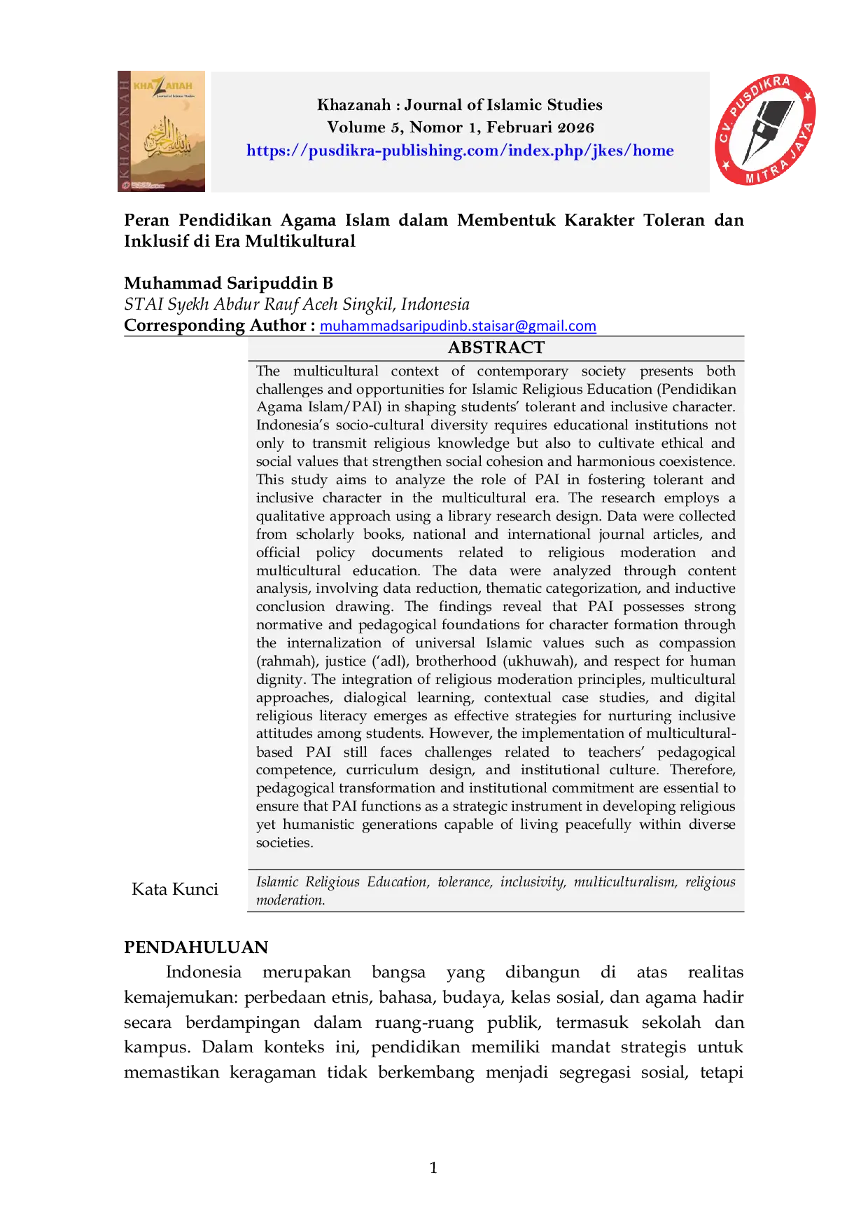 Khazanah : Journal of Islamic StudiesKhazanah : Journal of Islamic StudiesKonteks multikultural masyarakat kontemporer menawarkan tantangan sekaligus peluang bagi Pendidikan Agama Islam (PAI) dalam membentuk karakter toleran dan inklusif pada siswa. Keberagaman sosial-budaya Indonesia menuntut lembaga pendidikan tidak hanya mentransmisikan pengetahuan agama, tetapi juga menanamkan nilai-nilai etis dan sosial yang memperkuat kohesi sosial dan koeksistensi harmonis. Penelitian ini menganalisis peran PAI dalam membentuk karakter toleran dan inklusif di era multikultural. Pendekatan kualitatif digunakan dengan desain penelitian kepustakaan. Data dikumpulkan dari buku-buku ilmiah, artikel jurnal nasional dan internasional, serta dokumen kebijakan dan moderasi keagamaan. Analisis isi diterapkan untuk mengidentifikasi, mengkategorikan, dan menarik kesimpulan dari data. Temuan menunjukkan bahwa PAI memiliki fondasi normatif dan pedagogis yang kuat untuk pembentukan karakter melalui internalisasi nilai-nilai Islam universal seperti rahmah, adl, ukhuwah, dan penghormatan terhadap martabat manusia. Integrasi prinsip-prinsip moderasi beragama, pendekatan multikultural, pembelajaran dialogis, studi kasus kontekstual, dan literasi keagamaan digital terbukti sebagai strategi efektif dalam menumbuhkan sikap inklusif pada siswa. Namun, implementasi PAI berbasis multikultural masih menghadapi tantangan terkait kompetensi pedagogis guru, desain kurikulum, dan budaya institusional.