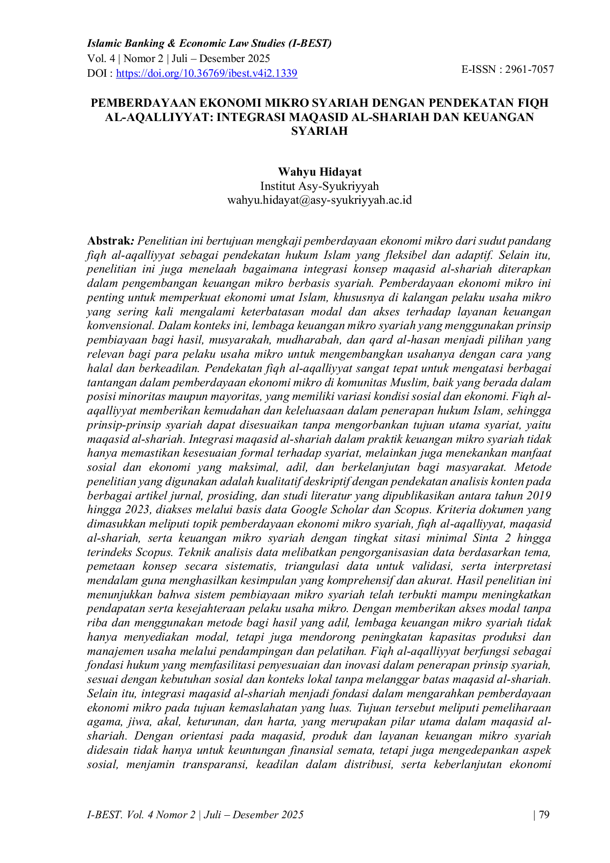 Islamic Banking & Economic Law Studies (I-BEST)Islamic Banking & Economic Law Studies (I-BEST)Penelitian ini bertujuan mengkaji pemberdayaan ekonomi mikro dari sudut pandang fiqh al-aqalliyyat sebagai pendekatan hukum Islam yang fleksibel dan adaptif. Selain itu, penelitian ini juga menelaah bagaimana integrasi konsep maqasid al-shariah diterapkan dalam pengembangan keuangan mikro berbasis syariah. Pemberdayaan ekonomi mikro ini penting untuk memperkuat ekonomi umat Islam, khususnya di kalangan pelaku usaha mikro yang sering kali mengalami keterbatasan modal dan akses terhadap layanan keuangan konvensional. Dalam konteks ini, lembaga keuangan mikro syariah yang menggunakan prinsip pembiayaan bagi hasil, musyarakah, mudharabah, dan qard al-hasan menjadi pilihan yang relevan bagi para pelaku usaha mikro untuk mengembangkan usahanya dengan cara yang halal dan berkeadilan. Pendekatan fiqh al-aqalliyyat sangat tepat untuk mengatasi berbagai tantangan dalam pemberdayaan ekonomi mikro di komunitas Muslim, baik yang berada dalam posisi minoritas maupun mayoritas, yang memiliki variasi kondisi sosial dan ekonomi. Fiqh al-aqalliyyat memberikan kemudahan dan keleluasaan dalam penerapan hukum Islam, sehingga prinsip-prinsip syariah dapat disesuaikan tanpa mengorbankan tujuan utama syariat, yaitu maqasid al-shariah. Integrasi maqasid al-shariah dalam praktik keuangan mikro syariah tidak hanya memastikan kesesuaian formal terhadap syariat, melainkan juga menekankan manfaat sosial dan ekonomi yang maksimal, adil, dan berkelanjutan bagi masyarakat.