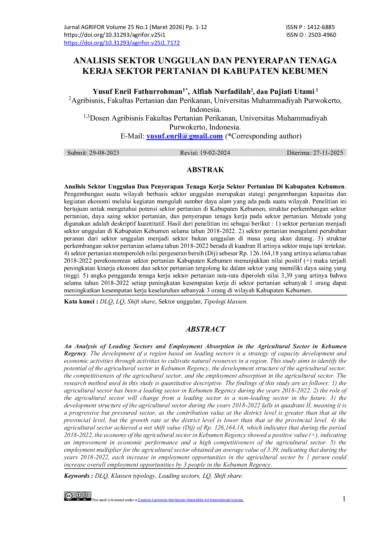 Berdasarkan analisis, sektor pertanian di Kabupaten Kebumen menunjukkan potensi sebagai sektor unggulan, meskipun terdapat indikasi perubahan peranan di masa depan.Struktur perkembangan sektor pertanian berada di kuadran II, mengindikasikan sektor yang maju namun tertekan.Angka pengganda tenaga kerja yang tinggi menunjukkan kontribusi signifikan sektor pertanian terhadap penyerapan tenaga kerja di wilayah tersebut.